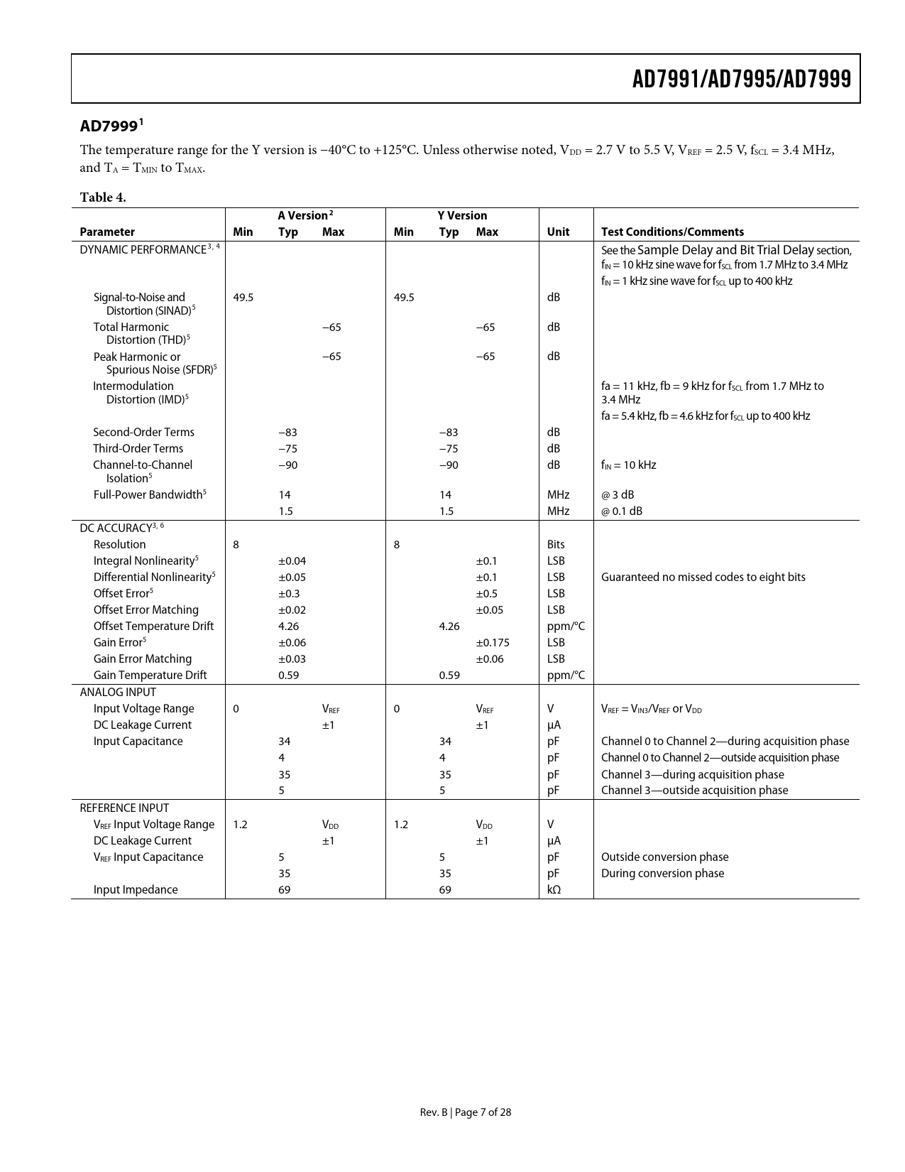 link to page 21 link to page 8 link to page 8 link to page 8 link to page 8 link to page 8 link to page 8 link to page 8 link to page 8 link to page 8 link to page 8 link to page 8 link to page 8 link to page 8 link to page 8 AD7991/AD7995/AD7999AD79991 The temperature range for the Y version is −40°C to +125°C. Unless otherwise noted, VDD = 2.7 V to 5.5 V, VREF = 2.5 V, fSCL = 3.4 MHz, and TA = TMIN to TMAX. Table 4. AVersion2 YVersionParameterMin Typ MaxMin TypMaxUnitTest Conditions/Comments DYNAMIC PERFORMANCE3, 4 See the Sample Delay and Bit Trial Delay section, fIN = 10 kHz sine wave for fSCL from 1.7 MHz to 3.4 MHz fIN = 1 kHz sine wave for fSCL up to 400 kHz Signal-to-Noise and 49.5 49.5 dB Distortion (SINAD)5 Total Harmonic −65 −65 dB Distortion (THD)5 Peak Harmonic or −65 −65 dB Spurious Noise (SFDR)5 Intermodulation fa = 11 kHz, fb = 9 kHz for fSCL from 1.7 MHz to Distortion (IMD)5 3.4 MHz fa = 5.4 kHz, fb = 4.6 kHz for fSCL up to 400 kHz Second-Order Terms −83 −83 dB Third-Order Terms −75 −75 dB Channel-to-Channel −90 −90 dB fIN = 10 kHz Isolation5 Full-Power Bandwidth5 14 14 MHz @ 3 dB 1.5 1.5 MHz @ 0.1 dB DC ACCURACY3, 6 Resolution 8 8 Bits Integral Nonlinearity5 ±0.04 ±0.1 LSB Differential Nonlinearity5 ±0.05 ±0.1 LSB Guaranteed no missed codes to eight bits Offset Error5 ±0.3 ±0.5 LSB Offset Error Matching ±0.02 ±0.05 LSB Offset Temperature Drift 4.26 4.26 ppm/°C Gain Error5 ±0.06 ±0.175 LSB Gain Error Matching ±0.03 ±0.06 LSB Gain Temperature Drift 0.59 0.59 ppm/°C ANALOG INPUT Input Voltage Range 0 VREF 0 VREF V VREF = VIN3/VREF or VDD DC Leakage Current ±1 ±1 μA Input Capacitance 34 34 pF Channel 0 to Channel 2—during acquisition phase 4 4 pF Channel 0 to Channel 2—outside acquisition phase 35 35 pF Channel 3—during acquisition phase 5 5 pF Channel 3—outside acquisition phase REFERENCE INPUT VREF Input Voltage Range 1.2 VDD 1.2 VDD V DC Leakage Current ±1 ±1 μA VREF Input Capacitance 5 5 pF Outside conversion phase 35 35 pF During conversion phase Input Impedance 69 69 kΩ Rev. B | Page 7 of 28 Document Outline FEATURES APPLICATIONS FUNCTIONAL BLOCK DIAGRAM GENERAL DESCRIPTION PRODUCT HIGHLIGHTS TABLE OF CONTENTS REVISION HISTORY SPECIFICATIONS AD7991 AD7995 AD7999 I2C TIMING SPECIFICATIONS ABSOLUTE MAXIMUM RATINGS ESD CAUTION PIN CONFIGURATION AND FUNCTION DESCRIPTIONS TYPICAL PERFORMANCE CHARACTERISTICS TERMINOLOGY THEORY OF OPERATION CONVERTER OPERATION ADC Transfer Function TYPICAL CONNECTION DIAGRAM ANALOG INPUT INTERNAL REGISTER STRUCTURE CONFIGURATION REGISTER SAMPLE DELAY AND BIT TRIAL DELAY CONVERSION RESULT REGISTER SERIAL INTERFACE SERIAL BUS ADDRESS WRITING TO THE AD7991/AD7995/AD7999 READING FROM THE AD7991/AD7995/AD7999 PLACING THE AD7991/AD7995/AD7999 INTO HIGH SPEED MODE MODE OF OPERATION OUTLINE DIMENSIONS ORDERING GUIDE