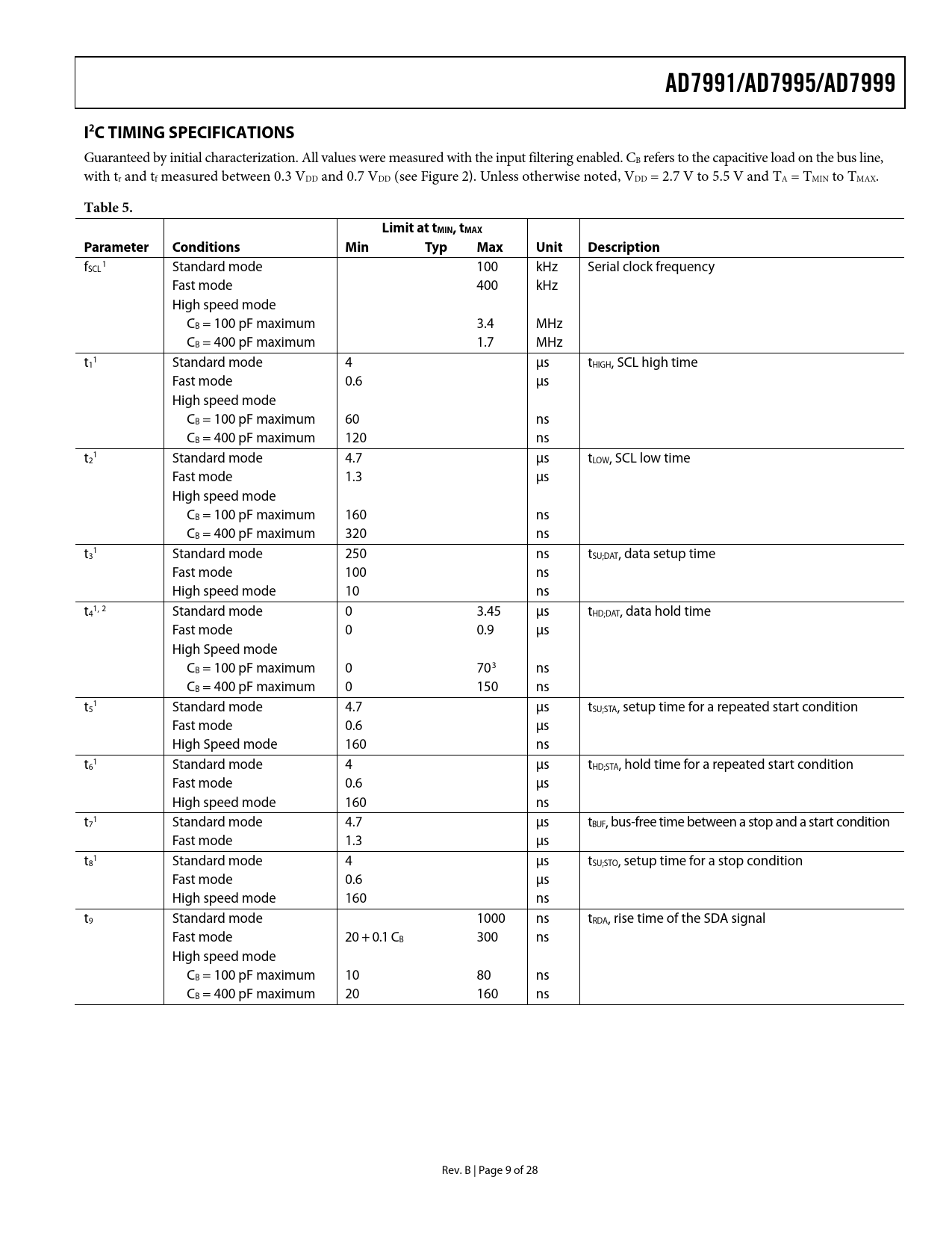 link to page 10 link to page 20 link to page 10 link to page 10 link to page 10 link to page 10 link to page 10 link to page 10 link to page 10 link to page 10 link to page 10 AD7991/AD7995/AD7999I2C TIMING SPECIFICATIONS Guaranteed by initial characterization. All values were measured with the input filtering enabled. CB refers to the capacitive load on the bus line, with tr and tf measured between 0.3 VDD and 0.7 VDD (see Figure 2). Unless otherwise noted, VDD = 2.7 V to 5.5 V and TA = TMIN to TMAX. Table 5.Limit at tMIN, tMAXParameter ConditionsMinTyp Max Unit Description f 1 SCL Standard mode 100 kHz Serial clock frequency Fast mode 400 kHz High speed mode CB = 100 pF maximum 3.4 MHz CB = 400 pF maximum 1.7 MHz t 1 1 Standard mode 4 μs tHIGH, SCL high time Fast mode 0.6 μs High speed mode CB = 100 pF maximum 60 ns CB = 400 pF maximum 120 ns t 1 2 Standard mode 4.7 μs tLOW, SCL low time Fast mode 1.3 μs High speed mode CB = 100 pF maximum 160 ns CB = 400 pF maximum 320 ns t 1 3 Standard mode 250 ns tSU;DAT, data setup time Fast mode 100 ns High speed mode 10 ns t 1, 2 4 Standard mode 0 3.45 μs tHD;DAT, data hold time Fast mode 0 0.9 μs High Speed mode CB = 100 pF maximum 0 703 ns CB = 400 pF maximum 0 150 ns t 1 5 Standard mode 4.7 μs tSU;STA, setup time for a repeated start condition Fast mode 0.6 μs High Speed mode 160 ns t 1 6 Standard mode 4 μs tHD;STA, hold time for a repeated start condition Fast mode 0.6 μs High speed mode 160 ns t 1 7 Standard mode 4.7 μs tBUF, bus-free time between a stop and a start condition Fast mode 1.3 μs t 1 8 Standard mode 4 μs tSU;STO, setup time for a stop condition Fast mode 0.6 μs High speed mode 160 ns t9 Standard mode 1000 ns tRDA, rise time of the SDA signal Fast mode 20 + 0.1 CB 300 ns High speed mode CB = 100 pF maximum 10 80 ns CB = 400 pF maximum 20 160 ns Rev. B | Page 9 of 28 Document Outline FEATURES APPLICATIONS FUNCTIONAL BLOCK DIAGRAM GENERAL DESCRIPTION PRODUCT HIGHLIGHTS TABLE OF CONTENTS REVISION HISTORY SPECIFICATIONS AD7991 AD7995 AD7999 I2C TIMING SPECIFICATIONS ABSOLUTE MAXIMUM RATINGS ESD CAUTION PIN CONFIGURATION AND FUNCTION DESCRIPTIONS TYPICAL PERFORMANCE CHARACTERISTICS TERMINOLOGY THEORY OF OPERATION CONVERTER OPERATION ADC Transfer Function TYPICAL CONNECTION DIAGRAM ANALOG INPUT INTERNAL REGISTER STRUCTURE CONFIGURATION REGISTER SAMPLE DELAY AND BIT TRIAL DELAY CONVERSION RESULT REGISTER SERIAL INTERFACE SERIAL BUS ADDRESS WRITING TO THE AD7991/AD7995/AD7999 READING FROM THE AD7991/AD7995/AD7999 PLACING THE AD7991/AD7995/AD7999 INTO HIGH SPEED MODE MODE OF OPERATION OUTLINE DIMENSIONS ORDERING GUIDE