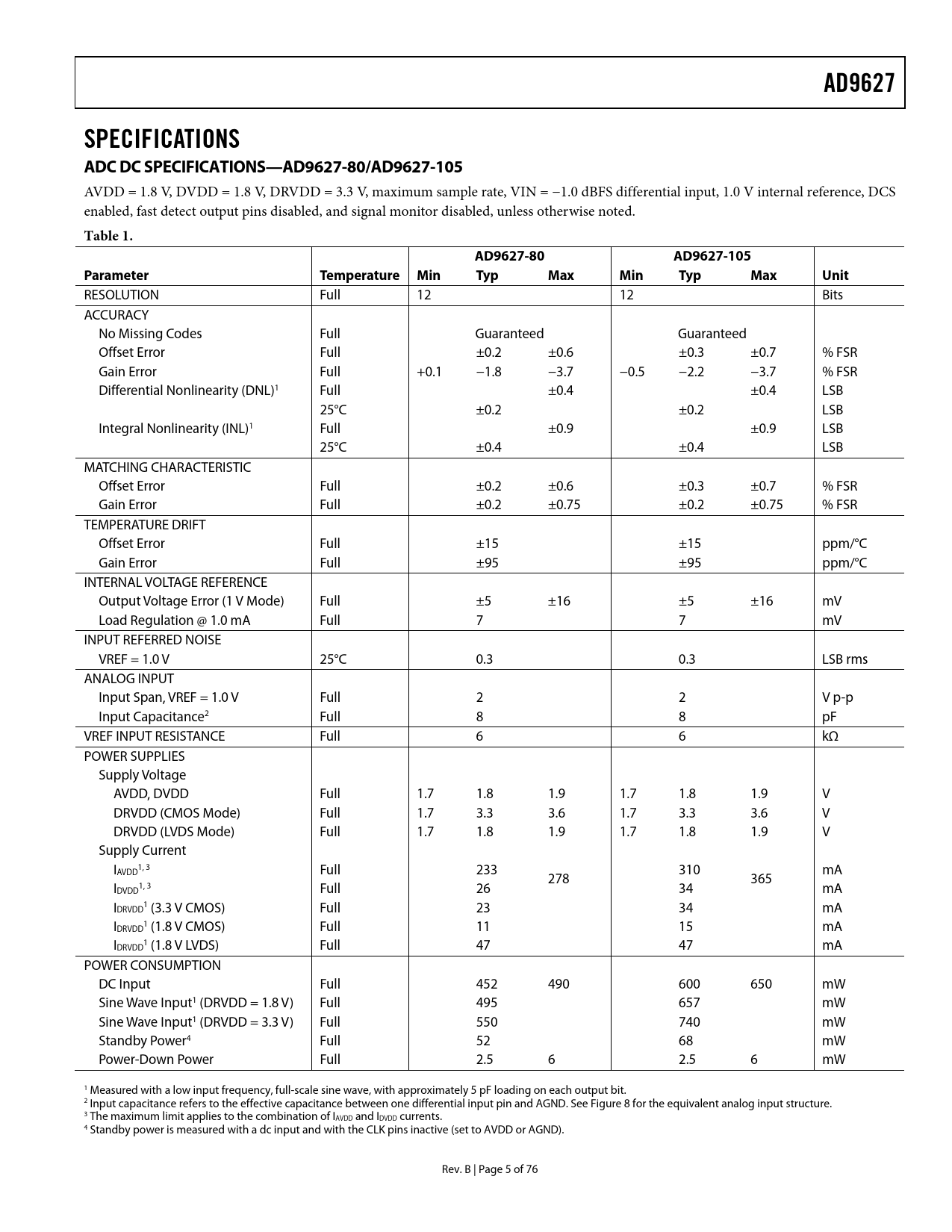 AD9627 SPECIFICATIONS ADC DC SPECIFICATIONS—AD9627-80/AD9627-105 Table 1 AD9627-80 AD9627-105 Parameter Temperature Min Typ
