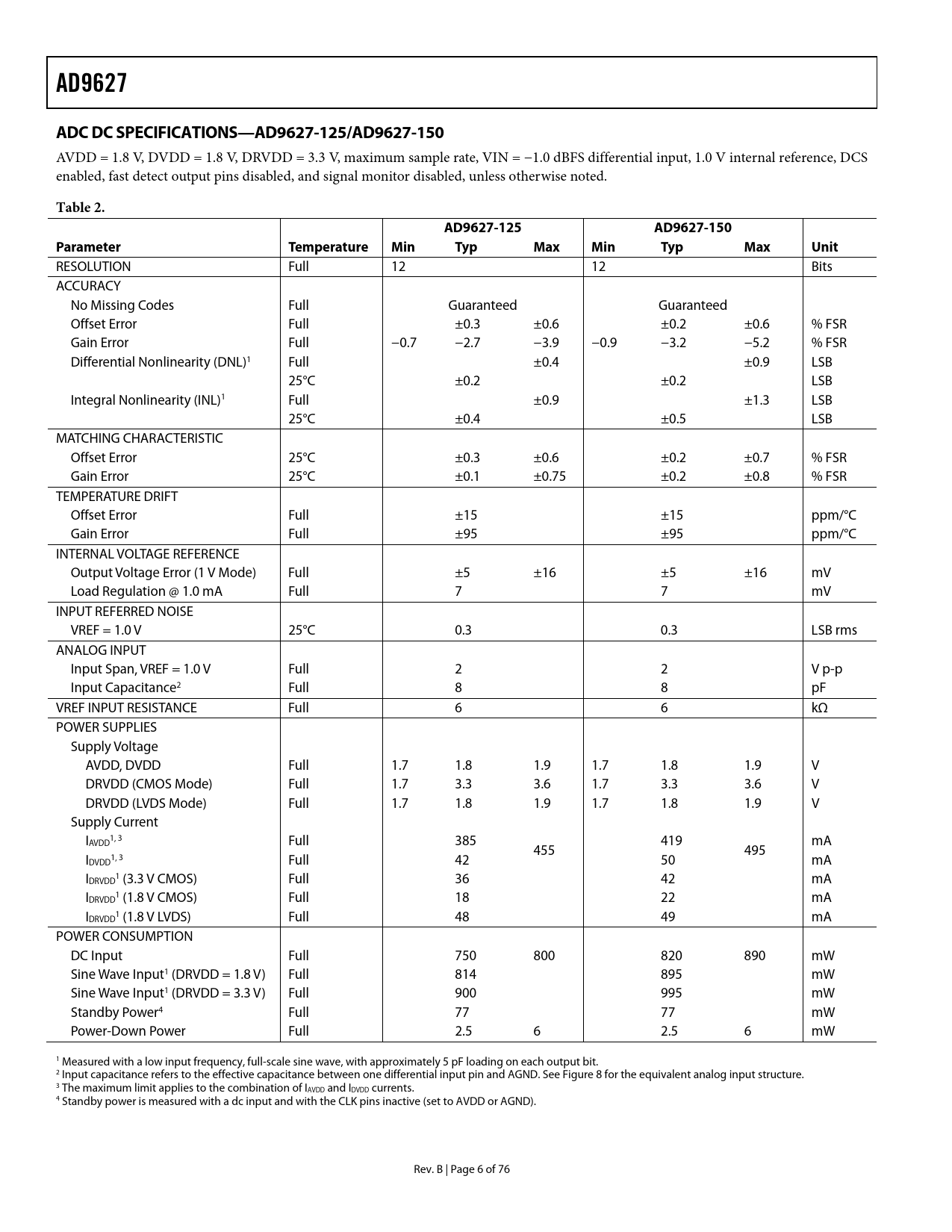 link to page 21 link to page 7 link to page 7 link to page 7 link to page 7 link to page 7 link to page 7 link to page 7 link to page 7 link to page 7 link to page 7 link to page 7 AD9627ADC DC SPECIFICATIONS—AD9627-125/AD9627-150 AVDD = 1.8 V, DVDD = 1.8 V, DRVDD = 3.3 V, maximum sample rate, VIN = −1.0 dBFS differential input, 1.0 V internal reference, DCS enabled, fast detect output pins disabled, and signal monitor disabled, unless otherwise noted. Table 2.AD9627-125 AD9627-150Parameter TemperatureMin TypMaxMin TypMax Unit RESOLUTION Full 12 12 Bits ACCURACY No Missing Codes Full Guaranteed Guaranteed Offset Error Full ±0.3 ±0.6 ±0.2 ±0.6 % FSR Gain Error Full −0.7 −2.7 −3.9 −0.9 −3.2 −5.2 % FSR Differential Nonlinearity (DNL)1 Full ±0.4 ±0.9 LSB 25°C ±0.2 ±0.2 LSB Integral Nonlinearity (INL)1 Full ±0.9 ±1.3 LSB 25°C ±0.4 ±0.5 LSB MATCHING CHARACTERISTIC Offset Error 25°C ±0.3 ±0.6 ±0.2 ±0.7 % FSR Gain Error 25°C ±0.1 ±0.75 ±0.2 ±0.8 % FSR TEMPERATURE DRIFT Offset Error Full ±15 ±15 ppm/°C Gain Error Full ±95 ±95 ppm/°C INTERNAL VOLTAGE REFERENCE Output Voltage Error (1 V Mode) Full ±5 ±16 ±5 ±16 mV Load Regulation @ 1.0 mA Full 7 7 mV INPUT REFERRED NOISE VREF = 1.0 V 25°C 0.3 0.3 LSB rms ANALOG INPUT Input Span, VREF = 1.0 V Full 2 2 V p-p Input Capacitance2 Full 8 8 pF VREF INPUT RESISTANCE Full 6 6 kΩ POWER SUPPLIES Supply Voltage AVDD, DVDD Full 1.7 1.8 1.9 1.7 1.8 1.9 V DRVDD (CMOS Mode) Full 1.7 3.3 3.6 1.7 3.3 3.6 V DRVDD (LVDS Mode) Full 1.7 1.8 1.9 1.7 1.8 1.9 V Supply Current I 1, 3 AVDD Full 385 419 mA 455 495 I 1, 3 DVDD Full 42 50 mA I 1 DRVDD (3.3 V CMOS) Full 36 42 mA I 1 DRVDD (1.8 V CMOS) Full 18 22 mA I 1 DRVDD (1.8 V LVDS) Full 48 49 mA POWER CONSUMPTION DC Input Full 750 800 820 890 mW Sine Wave Input1 (DRVDD = 1.8 V) Full 814 895 mW Sine Wave Input1 (DRVDD = 3.3 V) Full 900 995 mW Standby Power4 Full 77 77 mW Power-Down Power Full 2.5 6 2.5 6 mW 1 Measured with a low input frequency, full-scale sine wave, with approximately 5 pF loading on each output bit. 2 Input capacitance refers to the effective capacitance between one differential input pin and AGND. See Figure 8 for the equivalent analog input structure. 3 The maximum limit applies to the combination of IAVDD and IDVDD currents. 4 Standby power is measured with a dc input and with the CLK pins inactive (set to AVDD or AGND). Rev. B | Page 6 of 76 Document Outline Features Applications Functional Block Diagram Product Highlights Revision History General Description Specifications ADC DC Specifications—AD9627-80/AD9627-105 ADC DC Specifications—AD9627-125/AD9627-150 ADC AC Specifications—AD9627-80/AD9627-105 ADC AC Specifications—AD9627-125/AD9627-150 Digital Specifications Switching Specifications—AD9627-80/AD9627-105 Switching Specifications—AD9627-125/AD9627-150 Timing Specifications Timing Diagrams Absolute Maximum Ratings Thermal Characteristics ESD Caution Pin Configurations and Function Descriptions Equivalent Circuits Typical Performance Characteristics Theory of Operation ADC Architecture Analog Input Considerations Input Common Mode Differential Input Configurations Single-Ended Input Configuration Voltage Reference Internal Reference Connection External Reference Operation Clock Input Considerations Clock Input Options Input Clock Divider Clock Duty Cycle Jitter Considerations Power Dissipation and Standby Mode Digital Outputs Digital Output Enable Function (OEB) Timing Data Clock Output (DCO) ADC Overrange and Gain Control Fast Detect Overview ADC Fast Magnitude ADC Overrange (OR) Gain Switching Coarse Upper Threshold (C_UT) Fine Upper Threshold (F_UT) Fine Lower Threshold (F_LT) Increment Gain (IG) and Decrement Gain (DG) Signal Monitor Peak Detector Mode RMS/MS Magnitude Mode Threshold Crossing Mode Additional Control Bits Signal Monitor Enable Bit Complex Power Calculation Mode Enable Bit DC Correction DC Correction Bandwidth DC Correction Readback DC Correction Freeze DC Correction Enable Bits Signal Monitor SPORT Output SMI SCLK SMI SDFS SMI SDO Built-In Self-Test (BIST) and Output Test Built-In Self-Test (BIST) Output Test Modes Channel/Chip Synchronization Serial Port Interface (SPI) Configuration Using the SPI Hardware Interface Configuration Without the SPI SPI Accessible Features Memory Map Reading the Memory Map Register Table Open Locations Default Values Logic Levels Transfer Register Map Channel-Specific Registers Memory Map Register Table Memory Map Register Descriptions Sync Control (Register 0x100) Bit 7—Signal Monitor Sync Enable Bits[6:3]—Reserved Bit 2—Clock Divider Next Sync Only Bit 1—Clock Divider Sync Enable Bit 0—Master Sync Enable Fast Detect Control (Register 0x104) Bits[7:4]—Reserved Bits[3:1]—Fast Detect Mode Select Bit 0—Fast Detect Enable Coarse Upper Threshold (Register 0x105) Bits[7:3]—Reserved Bits[2:0]—Coarse Upper Threshold Fine Upper Threshold (Register 0x106 and Register 0x107) Register 0x106, Bits[7:0]—Fine Upper Threshold[7:0] Register 0x107, Bits[7:5]—Reserved Register 0x107, Bits[4:0]—Fine Upper Threshold[12:8] Fine Lower Threshold (Register 0x108 and Register 0x109) Register 0x108, Bits[7:0]—Fine Lower Threshold[7:0] Register 0x109, Bits[7:5]—Reserved Register 0x109, Bits[4:0]—Fine Lower Threshold[12:8] Increase Gain Dwell Time (Register 0x10A and Register 0x10B) Register 0x10A, Bits[7:0]—Increase Gain Dwell Time[7:0] Register 0x10B, Bits[7:0]—Increase Gain Dwell Time[15:8] Signal Monitor DC Correction Control (Register 0x10C) Bit 7—Reserved Bit 6—DC Correction Freeze Bits[5:2]—DC Correction Bandwidth Bit 1—DC Correction for Signal Path Enable Bit 0—DC Correction for Signal Monitor Enable Signal Monitor DC Value Channel A (Register 0x10D and Register 0x10E) Register 0x10D, Bits[7:0]—DC Value Channel A[7:0] Register 0x10E, Bits[7:6]—Reserved Register 0x10E, Bits[5:0]—DC Value Channel A[13:8] Signal Monitor DC Value Channel B (Register 0x10F 