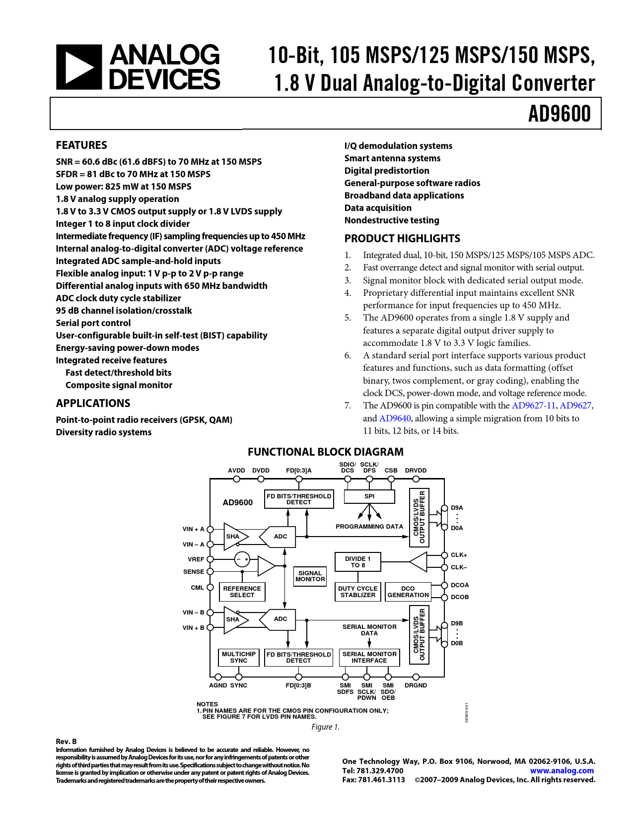 1. Integrated dual, 10-bit, 150 MSPS/125 MSPS/105 MSPS ADC.