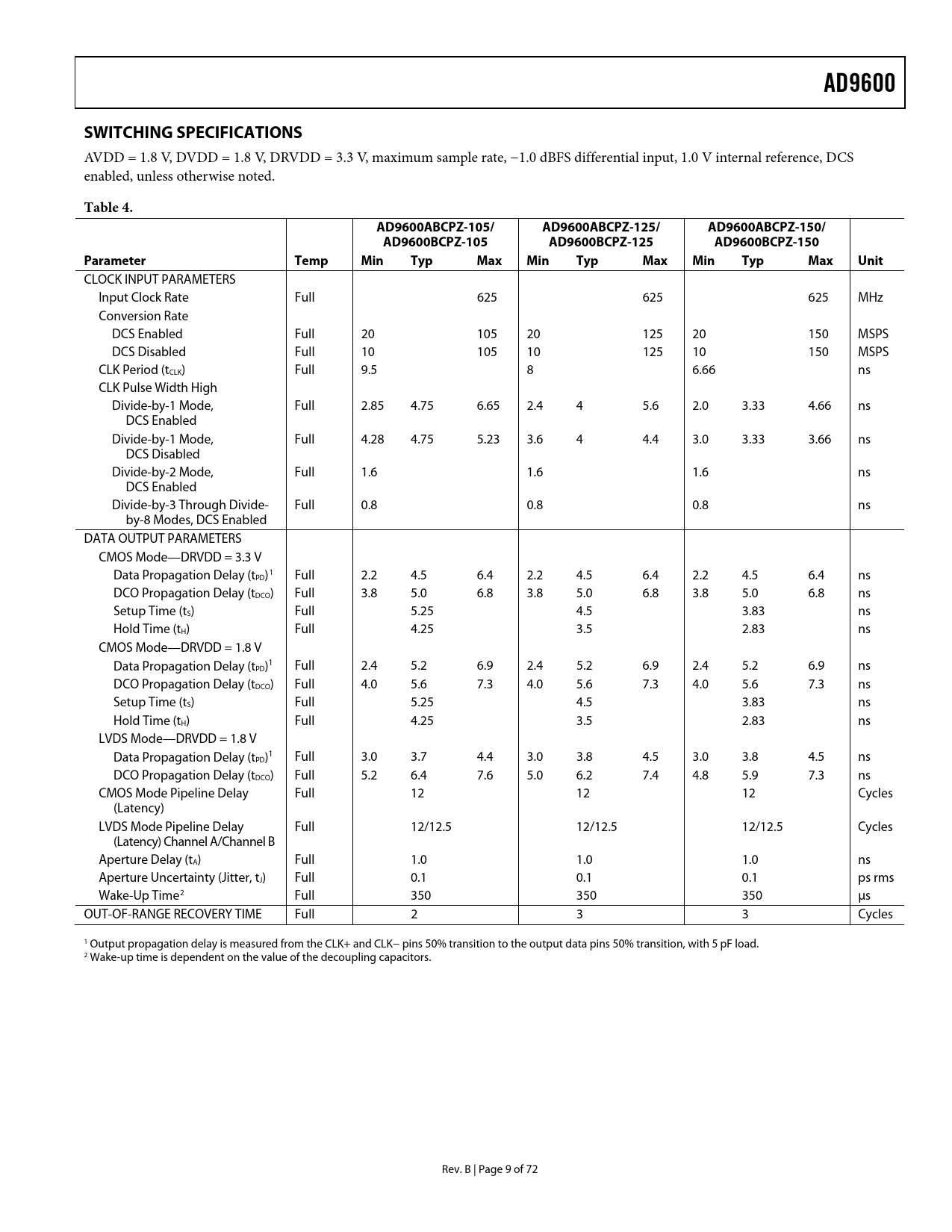 link to page 10 link to page 10 link to page 10 link to page 10 AD9600SWITCHING SPECIFICATIONS AVDD = 1.8 V, DVDD = 1.8 V, DRVDD = 3.3 V, maximum sample rate, −1.0 dBFS differential input, 1.0 V internal reference, DCS enabled, unless otherwise noted. Table 4.AD9600ABCPZ-105/AD9600ABCPZ-125/AD9600ABCPZ-150/AD9600BCPZ-105AD9600BCPZ-125AD9600BCPZ-150Parameter TempMin TypMax Min TypMax Min TypMax Unit CLOCK INPUT PARAMETERS Input Clock Rate Full 625 625 625 MHz Conversion Rate DCS Enabled Full 20 105 20 125 20 150 MSPS DCS Disabled Full 10 105 10 125 10 150 MSPS CLK Period (tCLK) Full 9.5 8 6.66 ns CLK Pulse Width High Divide-by-1 Mode, Full 2.85 4.75 6.65 2.4 4 5.6 2.0 3.33 4.66 ns DCS Enabled Divide-by-1 Mode, Full 4.28 4.75 5.23 3.6 4 4.4 3.0 3.33 3.66 ns DCS Disabled Divide-by-2 Mode, Full 1.6 1.6 1.6 ns DCS Enabled Divide-by-3 Through Divide- Full 0.8 0.8 0.8 ns by-8 Modes, DCS Enabled DATA OUTPUT PARAMETERS CMOS Mode—DRVDD = 3.3 V Data Propagation Delay (tPD)1 Full 2.2 4.5 6.4 2.2 4.5 6.4 2.2 4.5 6.4 ns DCO Propagation Delay (tDCO) Full 3.8 5.0 6.8 3.8 5.0 6.8 3.8 5.0 6.8 ns Setup Time (tS) Full 5.25 4.5 3.83 ns Hold Time (tH) Full 4.25 3.5 2.83 ns CMOS Mode—DRVDD = 1.8 V Data Propagation Delay (tPD)1 Full 2.4 5.2 6.9 2.4 5.2 6.9 2.4 5.2 6.9 ns DCO Propagation Delay (tDCO) Full 4.0 5.6 7.3 4.0 5.6 7.3 4.0 5.6 7.3 ns Setup Time (tS) Full 5.25 4.5 3.83 ns Hold Time (tH) Full 4.25 3.5 2.83 ns LVDS Mode—DRVDD = 1.8 V Data Propagation Delay (tPD)1 Full 3.0 3.7 4.4 3.0 3.8 4.5 3.0 3.8 4.5 ns DCO Propagation Delay (tDCO) Full 5.2 6.4 7.6 5.0 6.2 7.4 4.8 5.9 7.3 ns CMOS Mode Pipeline Delay Full 12 12 12 Cycles (Latency) LVDS Mode Pipeline Delay Full 12/12.5 12/12.5 12/12.5 Cycles (Latency) Channel A/Channel B Aperture Delay (tA) Full 1.0 1.0 1.0 ns Aperture Uncertainty (Jitter, tJ) Full 0.1 0.1 0.1 ps rms Wake-Up Time2 Full 350 350 350 μs OUT-OF-RANGE RECOVERY TIME Full 2 3 3 Cycles 1 Output propagation delay is measured from the CLK+ and CLK− pins 50% transition to the output data pins 50% transition, with 5 pF load. 2 Wake-up time is dependent on the value of the decoupling capacitors. Rev. B | Page 9 of 72 Document Outline FEATURES APPLICATIONS PRODUCT HIGHLIGHTS FUNCTIONAL BLOCK DIAGRAM TABLE OF CONTENTS REVISION HISTORY GENERAL DESCRIPTION SPECIFICATIONS DC SPECIFICATIONS AC SPECIFICATIONS DIGITAL SPECIFICATIONS SWITCHING SPECIFICATIONS TIMING CHARACTERISTICS TIMING DIAGRAMS ABSOLUTE MAXIMUM RATINGS THERMAL CHARACTERISTICS ESD CAUTION PIN CONFIGURATION AND FUNCTION DESCRIPTIONS EQUIVALENT CIRCUITS TYPICAL PERFORMANCE CHARACTERISTICS THEORY OF OPERATION ADC ARCHITECTURE ANALOG INPUT CONSIDERATIONS Input Common Mode Differential Input Configurations Single-Ended Input Configuration VOLTAGE REFERENCE Internal Reference Connection External Reference Operation CLOCK INPUT CONSIDERATIONS Clock Input Options Input Clock Divider Clock Duty Cycle Jitter Considerations POWER DISSIPATION AND STANDBY MODE DIGITAL OUTPUTS Digital Output Enable Function (OEB) TIMING Data Clock Output (DCO) ADC OVERRANGE AND GAIN CONTROL FAST DETECT OVERVIEW ADC FAST MAGNITUDE ADC OVERRANGE (OR) GAIN SWITCHING Coarse Upper Threshold (C_UT) Fine Upper Threshold (F_UT) Fine Lower Threshold (F_LT) Increment Gain (IG) and Decrement Gain (DG) SIGNAL MONITOR PEAK DETECTOR MODE RMS/MS MAGNITUDE MODE THRESHOLD CROSSING MODE ADDITIONAL CONTROL BITS Signal Monitor Enable Bit Complex Power Calculation Mode Enable Bit DC CORRECTION DC Correction Bandwidth DC Correction Readback DC Correction Freeze DC Correction Enable Bits SIGNAL MONITOR SPORT OUTPUT SMI SCLK SMI SDFS SMI SDO BUILT-IN SELF-TEST (BIST) AND OUTPUT TEST BUILT-IN SELF-TEST (BIST) OUTPUT TEST MODES CHANNEL/CHIP SYNCHRONIZATION SERIAL PORT INTERFACE (SPI) CONFIGURATION USING THE SPI HARDWARE INTERFACE CONFIGURATION WITHOUT THE SPI SPI ACCESSIBLE FEATURES MEMORY MAP READING THE MEMORY MAP TABLE Open Locations Default Values Logic Levels Transfer Register Map Channel-Specific Registers MEMORY MAP MEMORY MAP REGISTER DESCRIPTION Sync Control (Register 0x100) Bit 7—Signal Monitor Sync Enable Bits [6:3]—Reserved Bit 2—Clock Divider Next Sync Only Bit 1—Clock Divider Sync Enable Bit 0—Master Sync Enable Fast Detect Control (Register 0x104) Bits [7:4]—Reserved Bits [3:1]—Fast Detect Mode Select Bit 0—Fast Detect Enable Coarse Upper Threshold (Register 0x105) Bits [7:3]—Reserved Bits [2:0]—Coarse Upper Threshold Fine Upper Threshold (Register 0x106 and Register 0x107) Register 0x106, Bits [7:0]—Fine Upper Threshold [7:0] Register 0x107, Bits [7:5]—Reserved Register 0x107, Bits [4:0]—Fine Upper Threshold [12:8] Fine Lower Threshold (Register 0x108 and Register 0x109) Register 0x108, Bits [7:0]—Fine Lower Threshold [7:0]Register 0x109, Bits [7:5]—ReservedRegister 0x109, Bits [4:0]—Fine Lower Threshold [12:8] Increase Gain Dwell Time (Register 0x10A andRegister 0x10B) Register 0x10A, Bits [7:0]—Increase Gain Dwell Time [7:0]Register 0x10B, Bits [7:0]—Increase Gain Dwell Time [15:8] Signal Monitor DC Correction Control (Register 0x10C) Bit 7—ReservedBit 6—DC Correction Freeze Bits [5:2]—DC Correction Bandwidth Bit 1—DC Correction for Signal Path Enable Bit 0—DC Correction for Signal Monitor Enable Signal Monitor DC Value Channel A (Register 0x10D and Register 0x10E) Register 0x10D, Bits [7:0]—DC Value Channel A [7:0] Register 0x10E, Bits [7:6]—Reserved Register 0x10E, Bits [5:0]—DC Value Channel A [13:8] Signal Monitor DC Value Channel B (Register 0x10F and Register 0x110) Register 0x10F Bits [7:0]—DC Value Channel B [7:0] Register 0x110 Bits [7:6]—Reserved Register 0x110 Bits [5:0]—DC Value Channel B [13:8] Signal Monitor SPORT Control (Register 0x111) Bit 7—Reserved Bit 6—RMS/MS Magnitude Output Enable Bit 5—Peak Detector Output Enable Bit 4—Threshold Crossing Output Enable Bits [3:2]—SPORT SMI SCLK Divide Bit 1— SPORT SMI SCLK Sleep Bit 0—Signal Monitor SPORT Output Enable Signal Monitor Control 