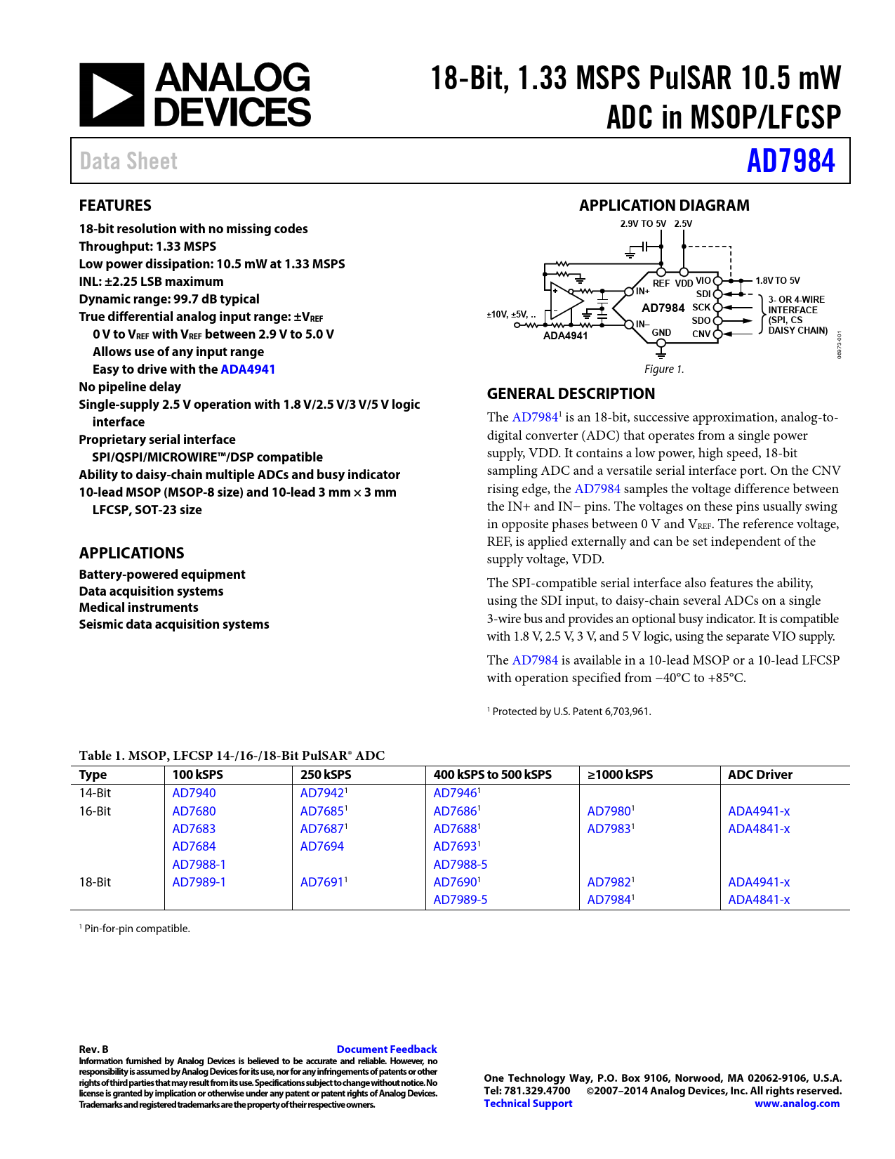 | Pages / Page | 25 / 1 — 18-Bit, 1.33 MSPS PulSAR 10.5 mW. ADC in MSOP/LFCSP. Data Sheet. AD7984. … |
