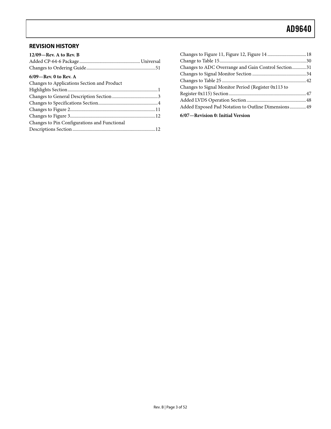 AD9640REVISION HISTORY12/09—Rev. A to Rev. B Changes to Figure 11, Figure 12, Figure 14 ... 18 Added CP-64-6 Package .. Universal Change to Table 15 .. 30 Changes to Ordering Guide ... 51 Changes to ADC Overrange and Gain Control Section .. 31 Changes to Signal Monitor Section .. 34 6/09—Rev. 0 to Rev. A Changes to Table 25 .. 42 Changes to Applications Section and Product Changes to Signal Monitor Period (Register 0x113 to Highlights Section ... 1 Register 0x115) Section .. 47 Changes to General Description Section ... 3 Added LVDS Operation Section ... 48 Changes to Specifications Section ... 4 Added Exposed Pad Notation to Outline Dimensions .. 49 Changes to Figure 2 ... 11 Changes to Figure 3 ... 12 6/07—Revision 0: Initial Version Changes to Pin Configurations and Functional Descriptions Section ... 12 Rev. B | Page 3 of 52 Document Outline FEATURES APPLICATIONS FUNCTIONAL BLOCK DIAGRAM PRODUCT HIGHLIGHTS TABLE OF CONTENTS REVISION HISTORY GENERAL DESCRIPTION SPECIFICATIONS ADC DC SPECIFICATIONS—AD9640ABCPZ-80, AD9640BCPZ80, AD9640ABCPZ-105, AND AD9640BCPZ-105 ADC DC SPECIFICATIONS—AD9640ABCPZ-125, AD9640BCPZ125, AD9640ABCPZ-150, AND AD9640BCPZ150 ADC AC SPECIFICATIONS—AD9640ABCPZ-80, AD9640BCPZ80, AD9640ABCPZ-105, AND AD9640BCPZ-105 ADC AC SPECIFICATIONS—AD9640ABCPZ-125, AD9640BCPZ125, AD9640ABCPZ-150, AND AD9640BCPZ 150 DIGITAL SPECIFICATIONS SWITCHING SPECIFICATIONS—AD9640ABCPZ-80, AD9640BCPZ-80, AD9640ABCPZ-105, AND AD9640BCPZ105 SWITCHING SPECIFICATIONS—AD9640ABCPZ-125, AD9640BCPZ-125, AD9640ABCPZ-150, AND AD9640BCPZ150 TIMING SPECIFICATIONS Timing Diagrams ABSOLUTE MAXIMUM RATINGS THERMAL CHARACTERISTICS ESD CAUTION PIN CONFIGURATIONS AND FUNCTION DESCRIPTIONS EQUIVALENT CIRCUITS TYPICAL PERFORMANCE CHARACTERISTICS THEORY OF OPERATION ADC ARCHITECTURE ANALOG INPUT CONSIDERATIONS Input Common Mode Differential Input Configurations Single-Ended Input Configuration VOLTAGE REFERENCE Internal Reference Connection External Reference Operation CLOCK INPUT CONSIDERATIONS Clock Input Options Input Clock Divider Clock Duty Cycle Jitter Considerations POWER DISSIPATION AND STANDBY MODE DIGITAL OUTPUTS Digital Output Enable Function (OEB) TIMING Data Clock Output (DCO) ADC OVERRANGE AND GAIN CONTROL FAST DETECT OVERVIEW ADC FAST MAGNITUDE ADC OVERRANGE (OR) GAIN SWITCHING Coarse Upper Threshold (C_UT) Fine Upper Threshold (F_UT) Fine Lower Threshold (F_LT) Increment Gain (IG) and Decrement Gain (DG) SIGNAL MONITOR PEAK DETECTOR MODE RMS/MS MAGNITUDE MODE THRESHOLD CROSSING MODE ADDITIONAL CONTROL BITS Signal Monitor Enable Bit Complex Power Calculation Mode Enable Bit DC CORRECTION DC Correction Bandwidth DC Correction Readback DC Correction Freeze DC Correction Enable Bits SIGNAL MONITOR SPORT OUTPUT SMI SCLK SMI SDFS SMI SDO BUILT-IN SELF-TEST (BIST) AND OUTPUT TEST BUILT-IN SELF-TEST (BIST) OUTPUT TEST MODES CHANNEL/CHIP SYNCHRONIZATION SERIAL PORT INTERFACE (SPI) CONFIGURATION USING THE SPI HARDWARE INTERFACE CONFIGURATION WITHOUT THE SPI SPI ACCESSIBLE FEATURES MEMORY MAP READING THE MEMORY MAP TABLE Open Locations Default Values Logic Levels Transfer Register Map Channel-Specific Registers EXTERNAL MEMORY MAP MEMORY MAP REGISTER DESCRIPTION Sync Control (Register 0x100) Bit 7—Signal Monitor Sync Enable Bits[6:3]—Reserved Bit 2—Clock Divider Next Sync Only Bit 1—Clock Divider Sync Enable Bit 0—Master Sync Enable Fast Detect Control (Register 0x104) Bits[7:4]—Reserved Bits[3:1]—Fast Detect Mode Select Bit 0—Fast Detect Enable Fine Upper Threshold (Register 0x106 and Register 0x107) Register 0x106, Bits[7:0]—Fine Upper Threshold[7:0] Register 0x107, Bits[7:5]—Reserved Register 0x107, Bits[4:0]—Fine Upper Threshold[12:8] Fine Lower Threshold (Register 0x108 and Register 0x109) Register 0x108, Bits[7:0]—Fine Lower Threshold[7:0]Register 0x109, Bits[7:5]—ReservedRegister 0x109, Bits[4:0]—Fine Lower Threshold[12:8] Signal Monitor DC Correction Control (Register 0x10C) Bit 7—ReservedBit 6—DC Correction Freeze Bits[5:2]—DC Correction Bandwidth Bit 1—DC Correction for Signal Path Enable Bit 0—DC Correction for SM Enable Signal Monitor DC Value Channel A (Register 0x10D and Register 0x10E) Register 0x10D, Bits[7:0]—Channel A DC Value[7:0] Register 0x10E, Bits[7:0]—Channel A DC Value[13:8] Signal Monitor DC Value Channel B (Register 0x10F and Register 0x110) Register 0x10F Bits[7:0]—Channel B DC Value[7:0] Register 0x110 Bits[7:0]—Channel B DC Value[13:8] Signal Monitor SPORT Control (Register 0x111) Bit 7—Reserved Bit 6—RMS/MS Magnitude Output Enable Bit 5—Peak Power Output Enable Bit 4—Threshold Crossing Output Enable Bits[3:2]—SPORT SMI SCLK Divide Bit 1— SPORT SMI SCLK Sleep Bit 0—Signal Monitor SPORT Output Enable Signal Monitor Control (Register 0x112) Bit 7—Complex Power Calculation Mode Enable Bits[6:4]—Reserved Bit 3—Signal Monitor RMS/MS Select Bits[2:1]—Signal Monitor Mode Bit 0—Signal Monitor Enable Signal Monitor Period (Register 0x113 to Register 0x115) Register 0x113, Bits[7:0]—Signal Monitor Period[7:0] Register 0x114, Bits[7:0]—Signal Monitor Period[15:8] Register 0x115, Bits[7:0]—Signal Monitor Period[23:16] Signal Monitor Result Channel A (Register 0x116 to Register 0x118) Register 0x116, Bits[7:0]—Signal Monitor Result Channel A[7:0] Register 0x117, Bits[7:0]—Signal Monitor Result Channel A[15:8] Register 0x118, Bits[7:4]—Reserved Register 0x118, Bits[3:0]—Signal Monitor Result Channel A[19:16] Signal Monitor Result Channel B (Register 0x119 to Register 0x11B) Register 0x119, Bits[7:0]— Signal Monitor Result Channel B[7:0] Register 0x11A, Bits[7:0]—Signal Monitor Result Channel B[15:8] Register 0x11B, Bits[7:4]—Reserved Register 0x11B, Bits[3:0]—Signal Monitor Result Channel B[19:16] APPLICATIONS INFORMATION DESIGN GUIDELINES Power and Ground Recommendations LVDS Operation Exposed Paddle Thermal Heat Slug Recommendations CML RBIAS Reference Decoupling SPI Port OUTLI