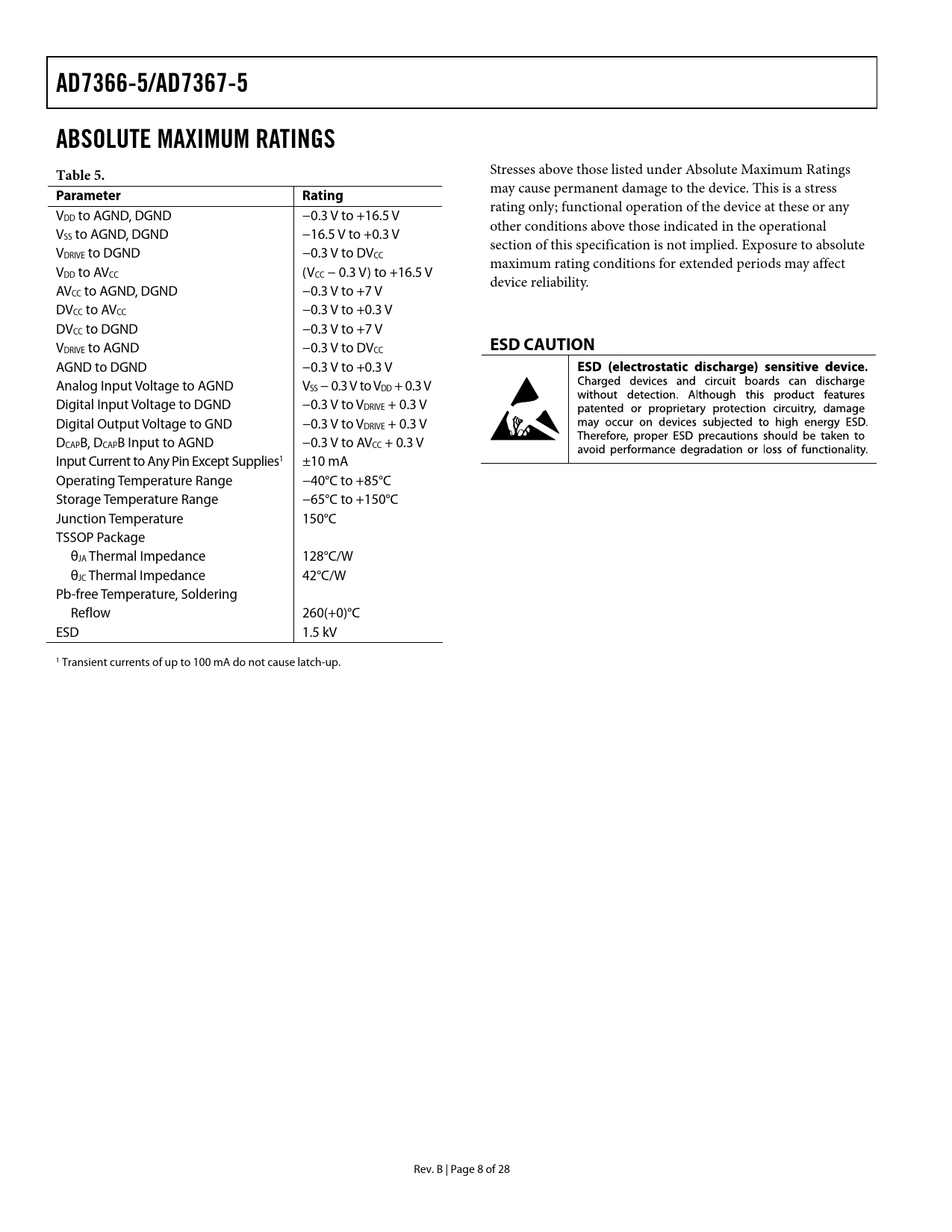 Pages / Page28 / 8 — AD7366-5/AD7367-5. ABSOLUTE MAXIMUM RATINGS. Table 5. Parameter Rating. …