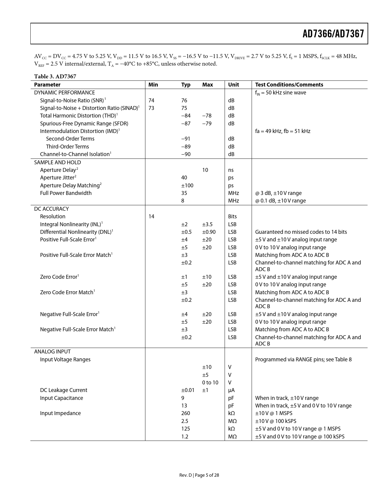 AD7366/AD7367. Table 3. AD7367 Parameter. Min. Typ. Max. Unit. Test Conditions/Comments
