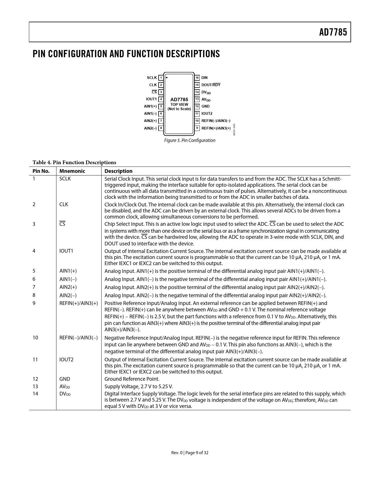 AD7785. PIN CONFIGURATION AND FUNCTION DESCRIPTIONS. SCLK 1. 16 DIN. CLK 2. 15 DOUT/RDY. CS 3. 14 DVDD. IOUT1 4. AVDD. AIN1(+). TOP VIEW