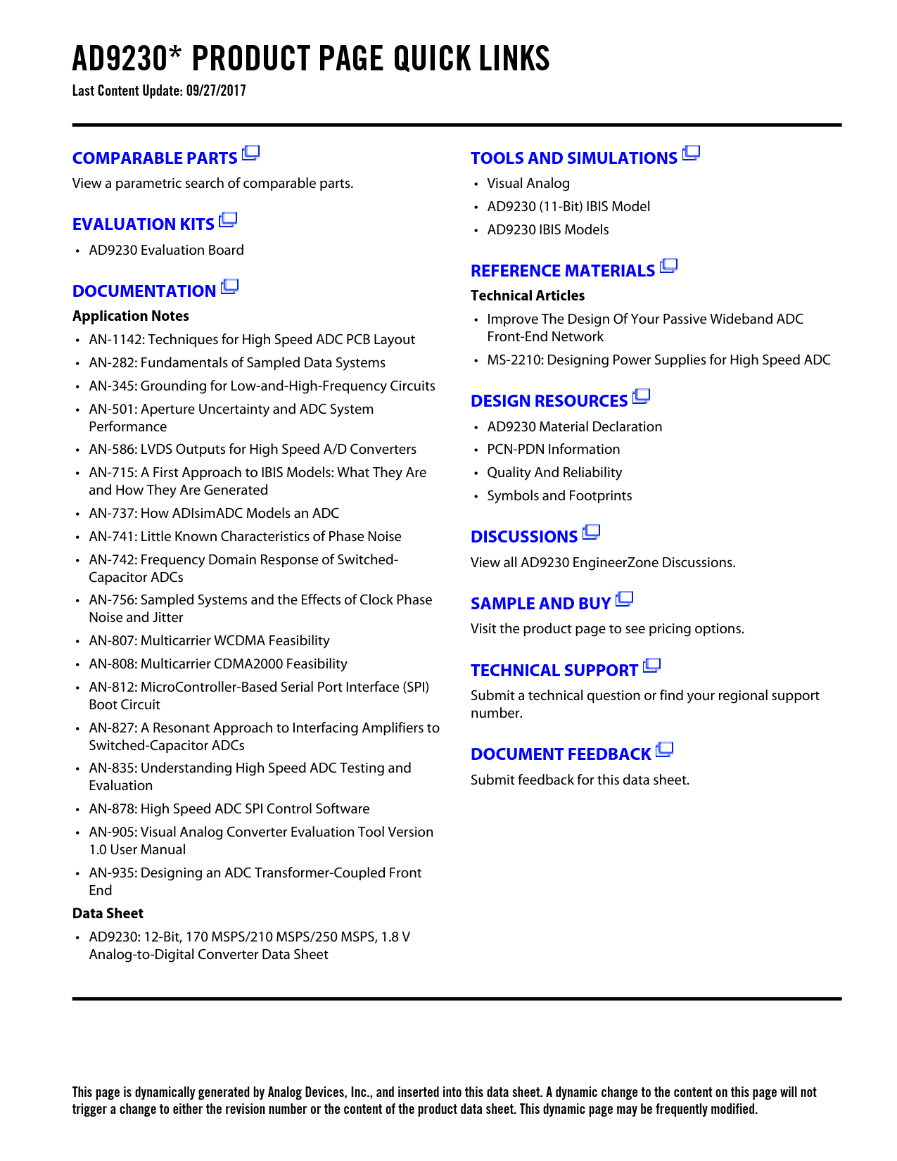 AD9230* PRODUCT PAGE QUICK LINKS Last Content Update: 09/27/2017. COMPARABLE PARTS. TOOLS AND SIMULATIONS. EVALUATION KITS