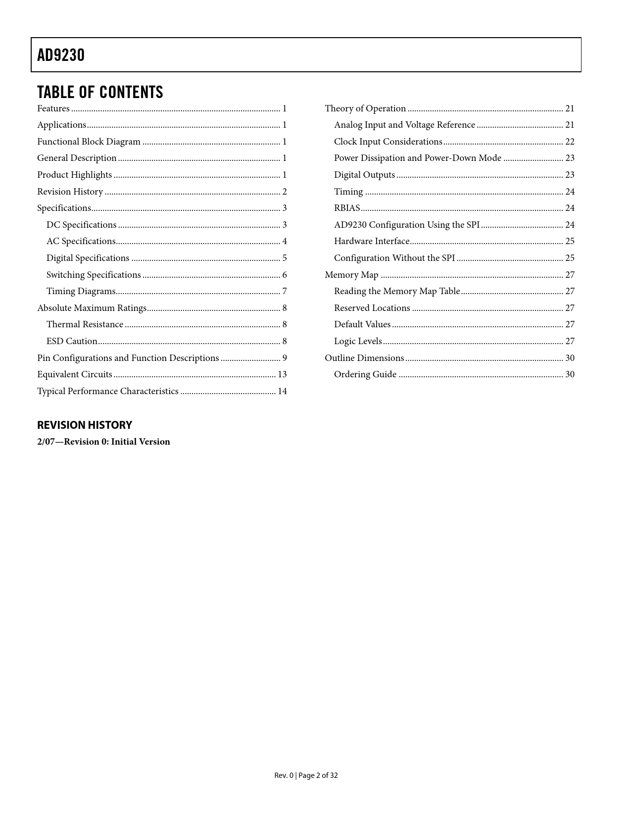 Pages / Page33 / 3 — AD9230. TABLE OF CONTENTS. REVISION HISTORY. 2/07—Revision 0: Initial …