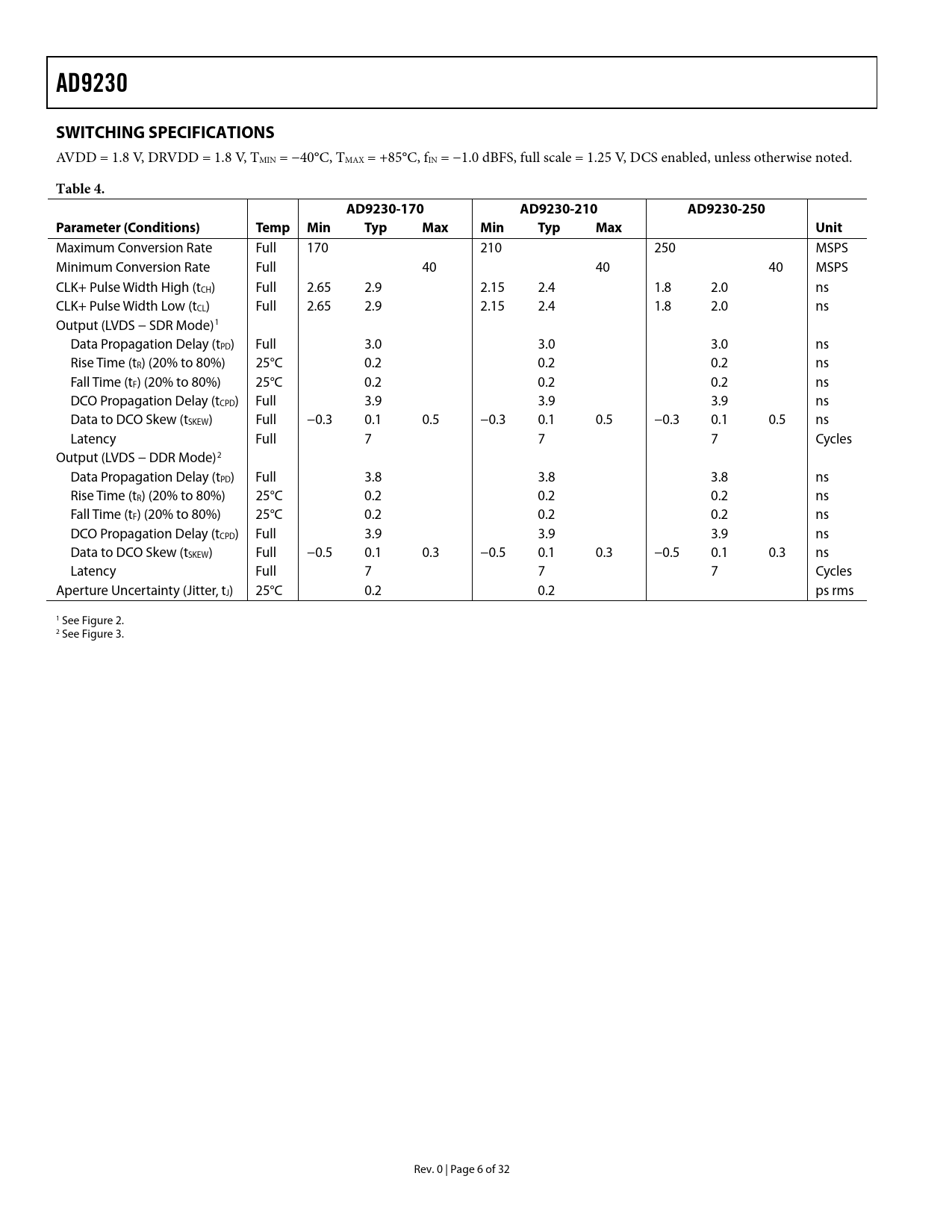 AD9230. SWITCHING SPECIFICATIONS. Table 4. AD9230-170. AD9230-210. AD9230-250. Parameter (Conditions). Temp Min. Typ. Max. Min. Unit