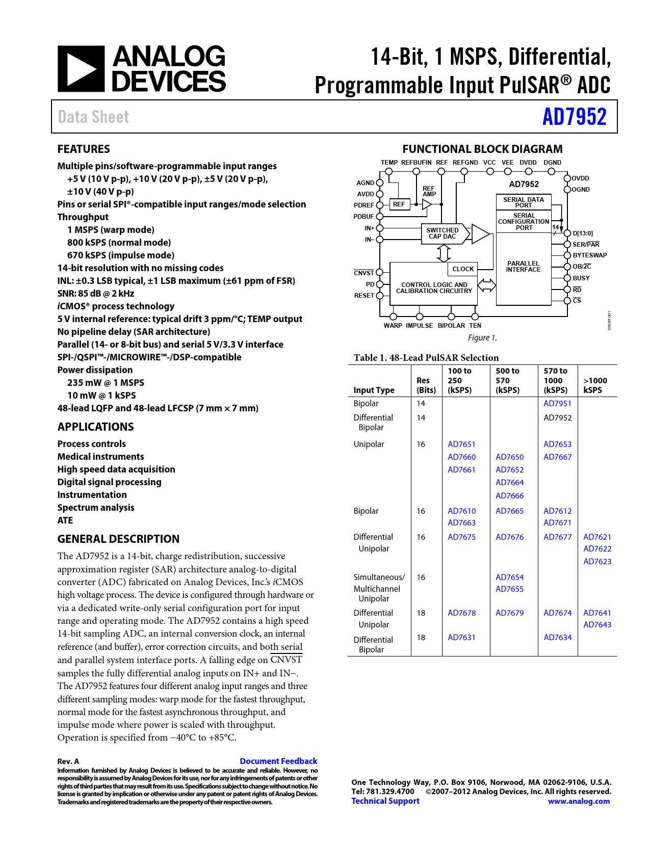 14-Bit, 1 MSPS, Differential,. Programmable Input PulSAR® ADC. Data Sheet. AD7952. FEATURES. FUNCTIONAL BLOCK DIAGRAM