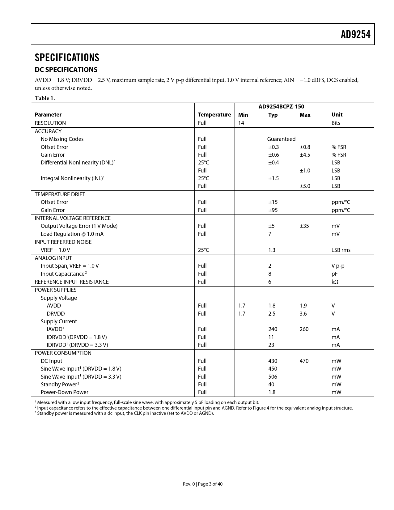 AD9254 SPECIFICATIONS DC SPECIFICATIONS Table 1 AD9254BCPZ-150 Parameter Temperature Min Typ Max Unit
