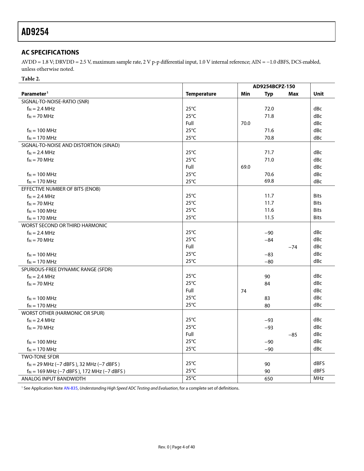 AD9254. AC SPECIFICATIONS. Table 2. AD9254BCPZ-150. Parameter1. Temperature. Min Typ Max Unit