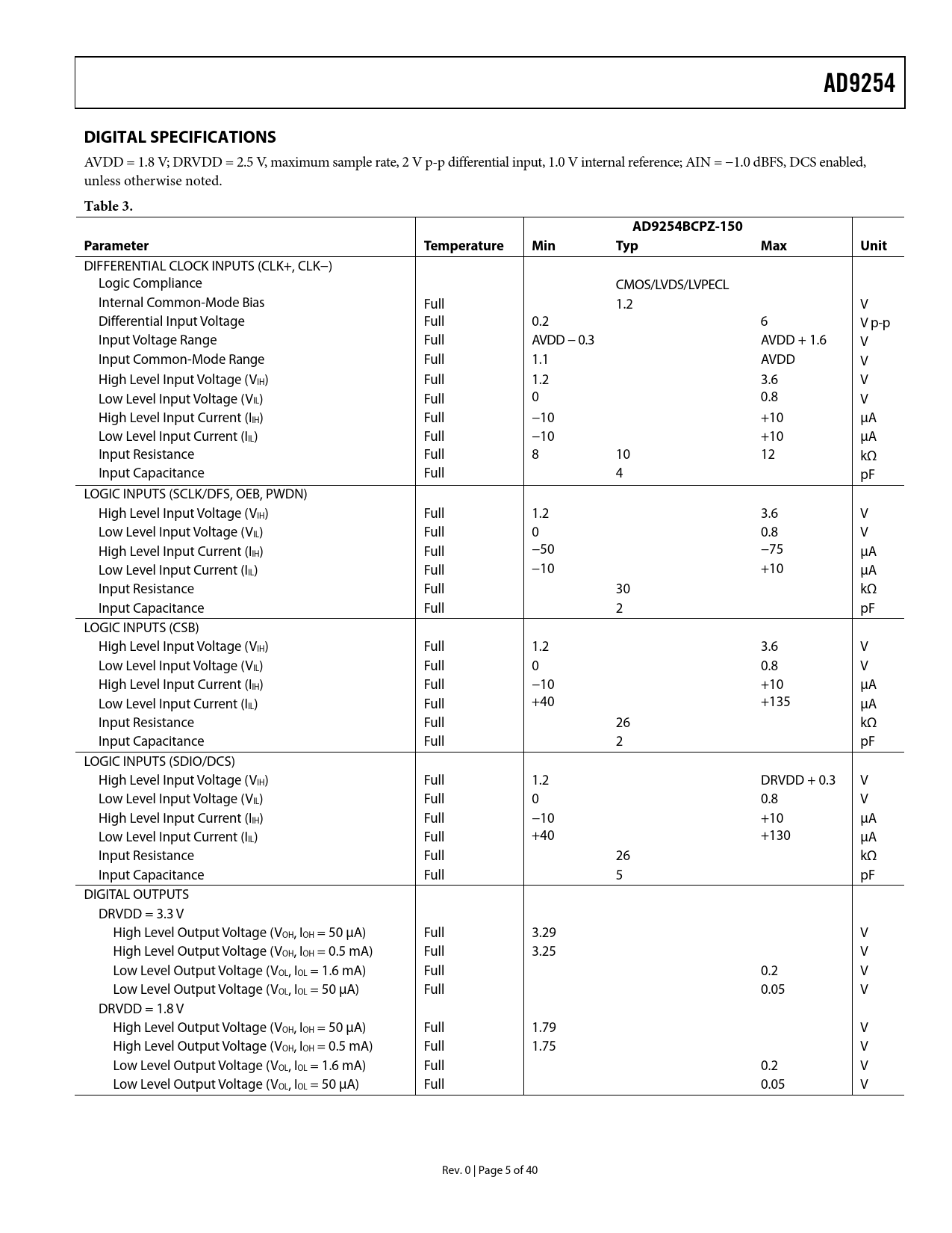 AD9254 DIGITAL SPECIFICATIONS Table 3 AD9254BCPZ-150 Parameter Temperature Min Typ Max Unit