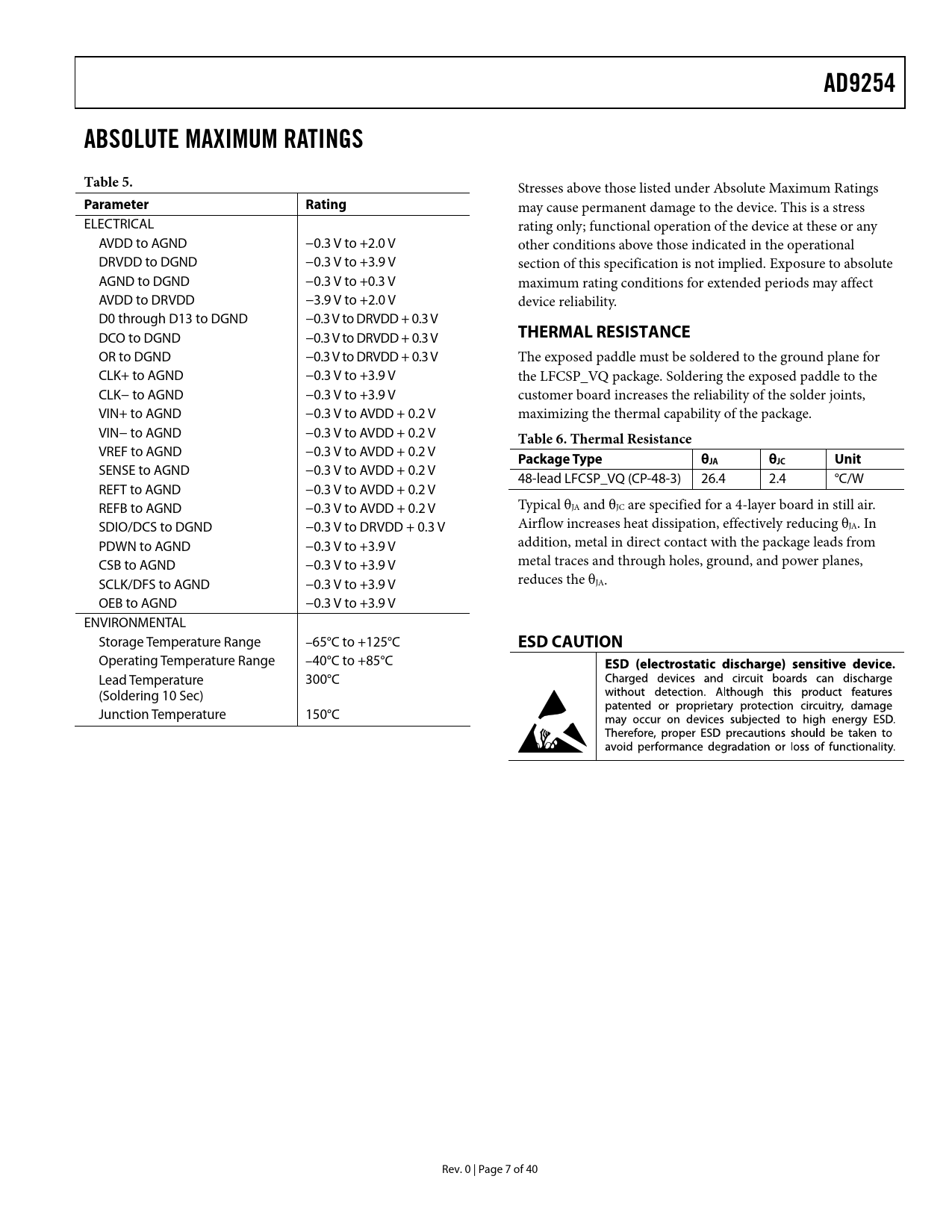 Pages / Page41 / 8 — AD9254. ABSOLUTE MAXIMUM RATINGS. Table 5. Parameter Rating. THERMAL …