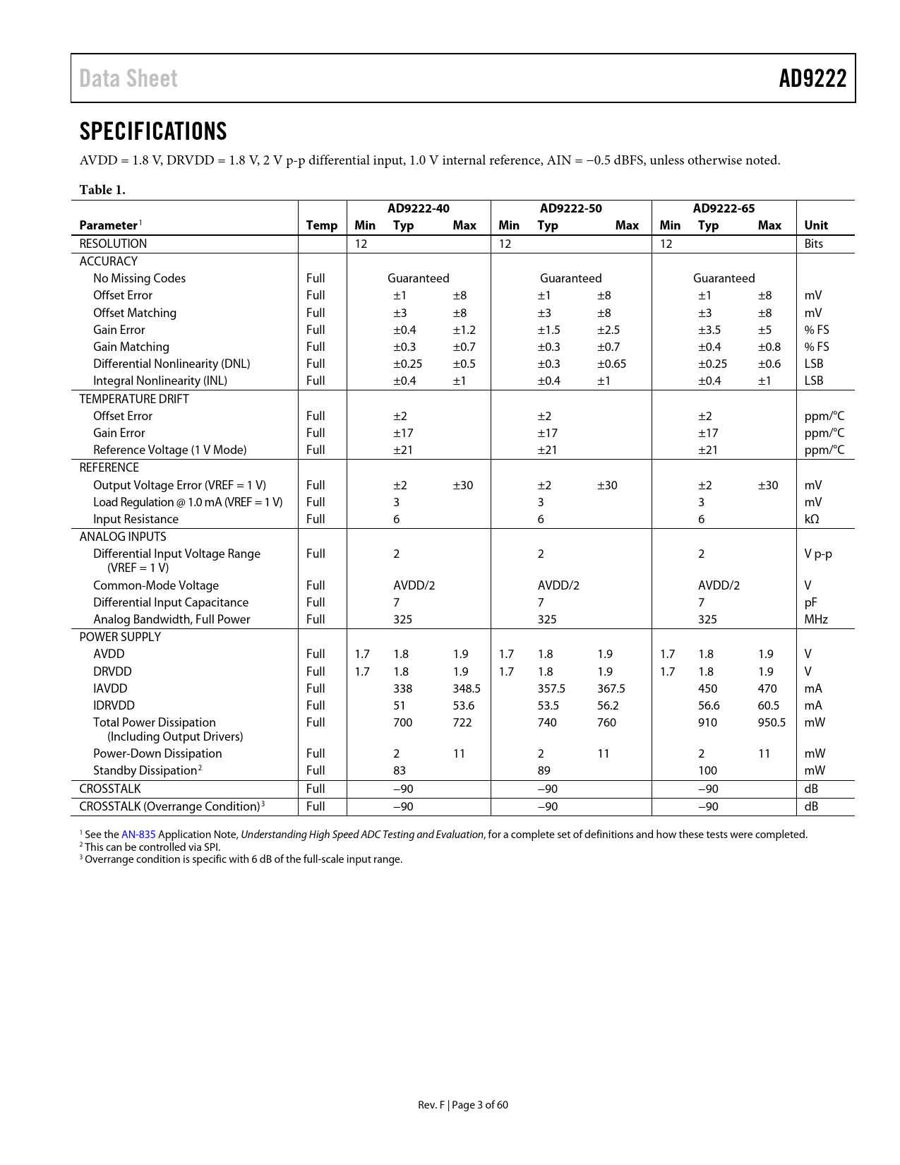 link to page 4 link to page 4 link to page 4 Data SheetAD9222SPECIFICATIONS AVDD = 1.8 V, DRVDD = 1.8 V, 2 V p-p differential input, 1.0 V internal reference, AIN = −0.5 dBFS, unless otherwise noted. Table 1.AD9222-40AD9222-50AD9222-65Parameter 1 Temp MinTypMaxMinTypMaxMinTypMaxUnit RESOLUTION 12 12 12 Bits ACCURACY No Missing Codes Full Guaranteed Guaranteed Guaranteed Offset Error Full ±1 ±8 ±1 ±8 ±1 ±8 mV Offset Matching Full ±3 ±8 ±3 ±8 ±3 ±8 mV Gain Error Full ±0.4 ±1.2 ±1.5 ±2.5 ±3.5 ±5 % FS Gain Matching Full ±0.3 ±0.7 ±0.3 ±0.7 ±0.4 ±0.8 % FS Differential Nonlinearity (DNL) Full ±0.25 ±0.5 ±0.3 ±0.65 ±0.25 ±0.6 LSB Integral Nonlinearity (INL) Full ±0.4 ±1 ±0.4 ±1 ±0.4 ±1 LSB TEMPERATURE DRIFT Offset Error Full ±2 ±2 ±2 ppm/°C Gain Error Full ±17 ±17 ±17 ppm/°C Reference Voltage (1 V Mode) Full ±21 ±21 ±21 ppm/°C REFERENCE Output Voltage Error (VREF = 1 V) Full ±2 ±30 ±2 ±30 ±2 ±30 mV Load Regulation @ 1.0 mA (VREF = 1 V) Full 3 3 3 mV Input Resistance Full 6 6 6 kΩ ANALOG INPUTS Differential Input Voltage Range Full 2 2 2 V p-p (VREF = 1 V) Common-Mode Voltage Full AVDD/2 AVDD/2 AVDD/2 V Differential Input Capacitance Full 7 7 7 pF Analog Bandwidth, Full Power Full 325 325 325 MHz POWER SUPPLY AVDD Full 1.7 1.8 1.9 1.7 1.8 1.9 1.7 1.8 1.9 V DRVDD Full 1.7 1.8 1.9 1.7 1.8 1.9 1.7 1.8 1.9 V IAVDD Full 338 348.5 357.5 367.5 450 470 mA IDRVDD Full 51 53.6 53.5 56.2 56.6 60.5 mA Total Power Dissipation Full 700 722 740 760 910 950.5 mW (Including Output Drivers) Power-Down Dissipation Full 2 11 2 11 2 11 mW Standby Dissipation2 Full 83 89 100 mW CROSSTALK Full −90 −90 −90 dB CROSSTALK (Overrange Condition)3 Full −90 −90 −90 dB 1 See the AN-835 Application Note, Understanding High Speed ADC Testing and Evaluation, for a complete set of definitions and how these tests were completed. 2 This can be controlled via SPI. 3 Overrange condition is specific with 6 dB of the ful -scale input range. Rev. F | Page 3 of 60 Document Outline Features Applications General Description Functional Block Diagram Product Highlights Table of Contents Revision History Specifications AC Specifications Digital Specifications Switching Specifications Timing Diagrams Absolute Maximum Ratings Thermal Impedance ESD Caution Pin Configuration and Function Descriptions Equivalent Circuits Typical Performance Characteristics Theory of Operation Analog Input Considerations Differential Input Configurations Single-Ended Input Configuration Clock Input Considerations Clock Duty Cycle Considerations Clock Jitter Considerations Power Dissipation and Power-Down Mode Digital Outputs and Timing SDIO/ODM Pin SCLK/DTP Pin CSB Pin RBIAS Pin Voltage Reference Internal Reference Operation External Reference Operation Serial Port Interface (SPI) Hardware Interface Memory Map Reading the Memory Map Table Reserved Locations Default Values Logic Levels Power and Ground Recommendations Exposed Paddle Thermal Heat Slug Recommendations Evaluation Board Power Supplies Input Signals Output Signals Default Operation and Jumper Selection Settings Alternative Analog Input Drive Configuration Outline Dimensions Ordering Guide