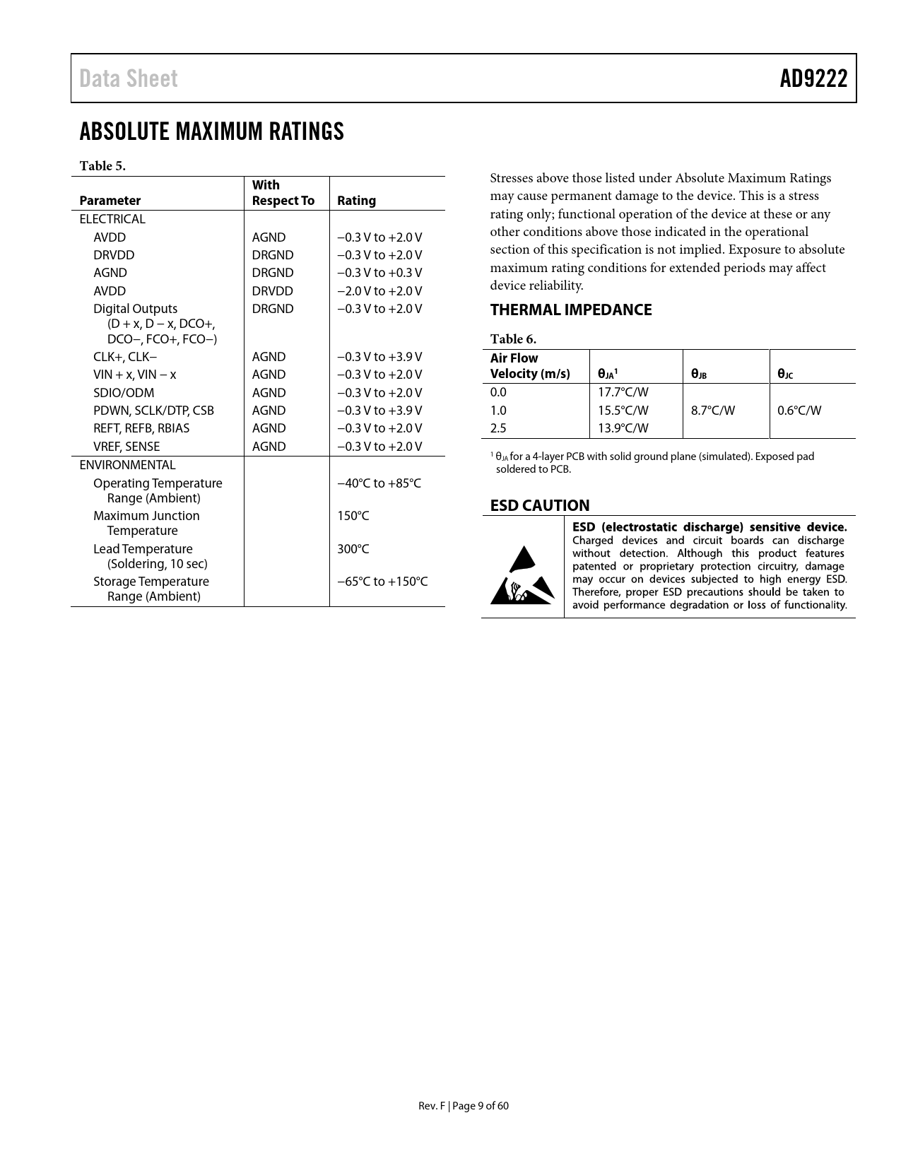Data Sheet. AD9222. ABSOLUTE MAXIMUM RATINGS. Table 5. With. Parameter. Respect To. Rating. THERMAL IMPEDANCE. Table 6. Air Flow