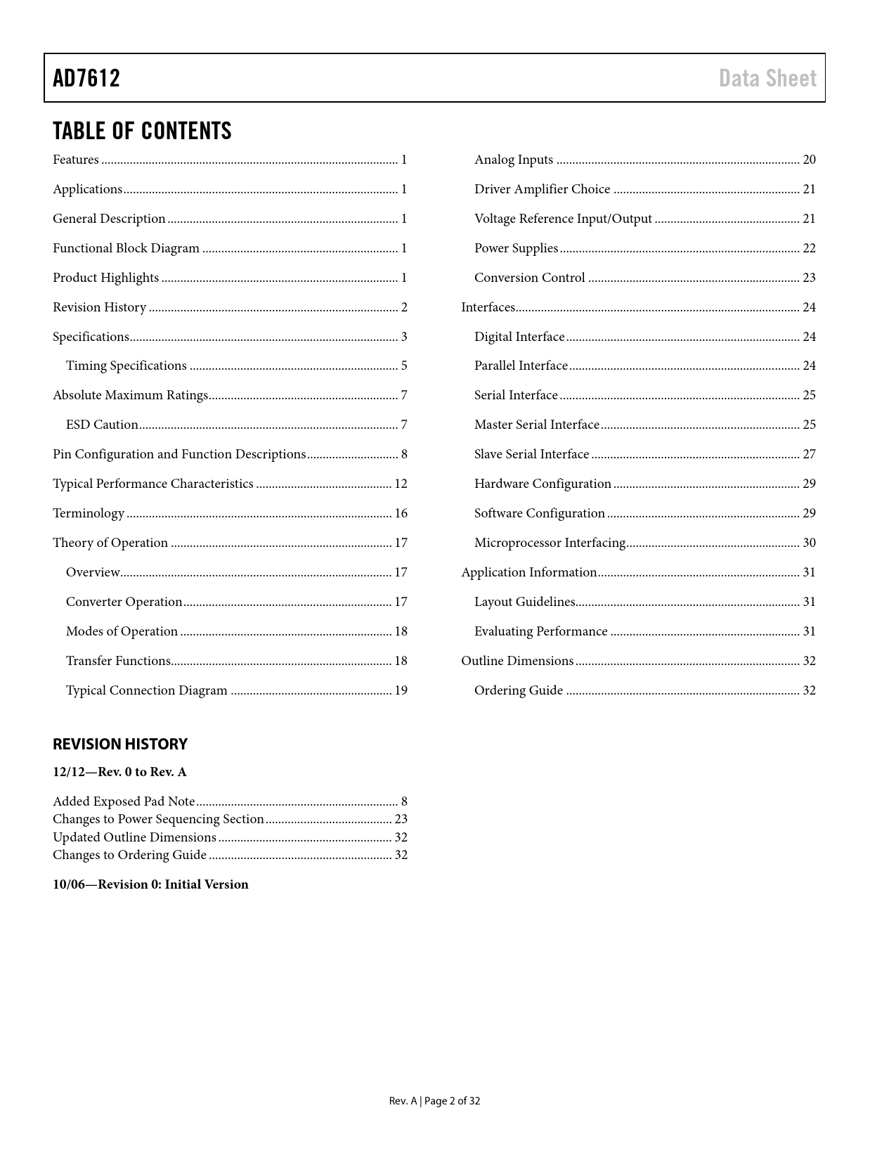 link to page 1 link to page 1 link to page 1 link to page 1 link to page 1 link to page 1 link to page 1 link to page 1 link to page 3 link to page 4 link to page 4 link to page 6 link to page 6 link to page 8 link to page 8 link to page 8 link to page 8 link to page 9 link to page 9 link to page 13 link to page 13 link to page 17 link to page 17 link to page 18 link to page 18 link to page 18 link to page 18 link to page 18 link to page 18 link to page 19 link to page 19 link to page 19 link to page 19 link to page 20 link to page 20 link to page 21 link to page 21 link to page 22 link to page 22 link to page 22 link to page 23 link to page 23 link to page 24 link to page 24 link to page 25 link to page 25 link to page 25 link to page 25 link to page 25 link to page 26 link to page 26 link to page 26 link to page 26 link to page 28 link to page 28 link to page 30 link to page 30 link to page 30 link to page 30 link to page 31 link to page 31 link to page 32 link to page 32 link to page 32 link to page 32 link to page 32 link to page 33 link to page 33 link to page 33 link to page 1 link to page 1 link to page 3 link to page 22 link to page 25 link to page 32 link to page 33 AD7612Data SheetTABLE OF CONTENTS Features .. 1 Analog Inputs ... 20 Applications ... 1 Driver Amplifier Choice ... 21 General Description ... 1 Voltage Reference Input/Output .. 21 Functional Block Diagram .. 1 Power Supplies .. 22 Product Highlights ... 1 Conversion Control ... 23 Revision History ... 2 Interfaces.. 24 Specifications ... 3 Digital Interface .. 24 Timing Specifications .. 5 Parallel Interface ... 24 Absolute Maximum Ratings .. 7 Serial Interface .. 25 ESD Caution .. 7 Master Serial Interface ... 25 Pin Configuration and Function Descriptions ... 8 Slave Serial Interface .. 27 Typical Performance Characteristics ... 12 Hardware Configuration ... 29 Terminology .. 16 Software Configuration ... 29 Theory of Operation .. 17 Microprocessor Interfacing ... 30 Overview .. 17 Application Information .. 31 Converter Operation .. 17 Layout Guidelines... 31 Modes of Operation ... 18 Evaluating Performance .. 31 Transfer Functions.. 18 Outline Dimensions ... 32 Typical Connection Diagram ... 19 Ordering Guide .. 32 REVISION HISTORY12/12—Rev. 0 to Rev. A Added Exposed Pad Note .. 8 Changes to Power Sequencing Section .. 23 Updated Outline Dimensions ... 32 Changes to Ordering Guide .. 32 10/06—Revision 0: Initial Version Rev. A | Page 2 of 32 Document Outline FEATURES APPLICATIONS GENERAL DESCRIPTION FUNCTIONAL BLOCK DIAGRAM PRODUCT HIGHLIGHTS TABLE OF CONTENTS REVISION HISTORY SPECIFICATIONS TIMING SPECIFICATIONS ABSOLUTE MAXIMUM RATINGS ESD CAUTION PIN CONFIGURATION AND FUNCTION DESCRIPTIONS TYPICAL PERFORMANCE CHARACTERISTICS TERMINOLOGY THEORY OF OPERATION OVERVIEW CONVERTER OPERATION MODES OF OPERATION Normal Mode Impulse Mode TRANSFER FUNCTIONS TYPICAL CONNECTION DIAGRAM ANALOG INPUTS Input Range Selection Input Structure VOLTAGE REFERENCE INPUT/OUTPUT Internal Reference (REF = 5 V) (PDREF = Low, PDBUF = Low) External 2.5 V Reference and Internal Buffer (REF = 5 V) (PDREF = High, PDBUF = Low) External 5 V Reference (PDREF = High, PDBUF = High) Reference Decoupling Temperature Sensor POWER SUPPLIES Core Supplies High Voltage Supplies Digital Output Supply Power Sequencing Power Dissipation vs. Throughput Power Down CONVERSION CONTROL INTERFACES DIGITAL INTERFACE RESET PARALLEL INTERFACE Master Parallel Interface Slave Parallel Interface 8-Bit Interface (Master or Slave) SERIAL INTERFACE Data Interface MASTER SERIAL INTERFACE Internal Clock (SER/ = high, EXT/ = Low) Read During Convert (RDC = High) Read During Convert (RDC = Low, DIVSCLK[1:0] = [0 to 3]) SLAVE SERIAL INTERFACE External Clock (SER/ = High, EXT/ = High) External Discontinuous Clock Data Read After Conversion Daisy-Chain Feature External Clock Data Read During Previous Conversion External Clock Data Read After/During Conversion HARDWARE CONFIGURATION SOFTWARE CONFIGURATION MICROPROCESSOR INTERFACING SPI Interface APPLICATION INFORMATION LAYOUT GUIDELINES EVALUATING PERFORMANCE OUTLINE DIMENSIONS ORDERING GUIDE