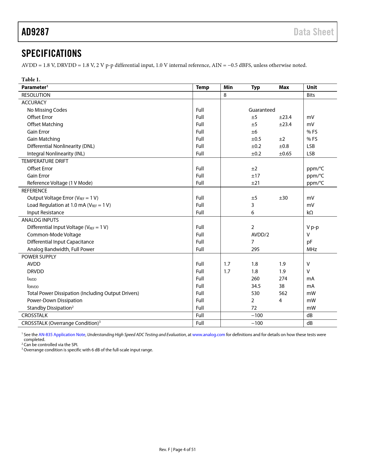 AD9287. Data Sheet. SPECIFICATIONS. Table 1. Parameter1. Temp. Min. Typ. Max. Unit