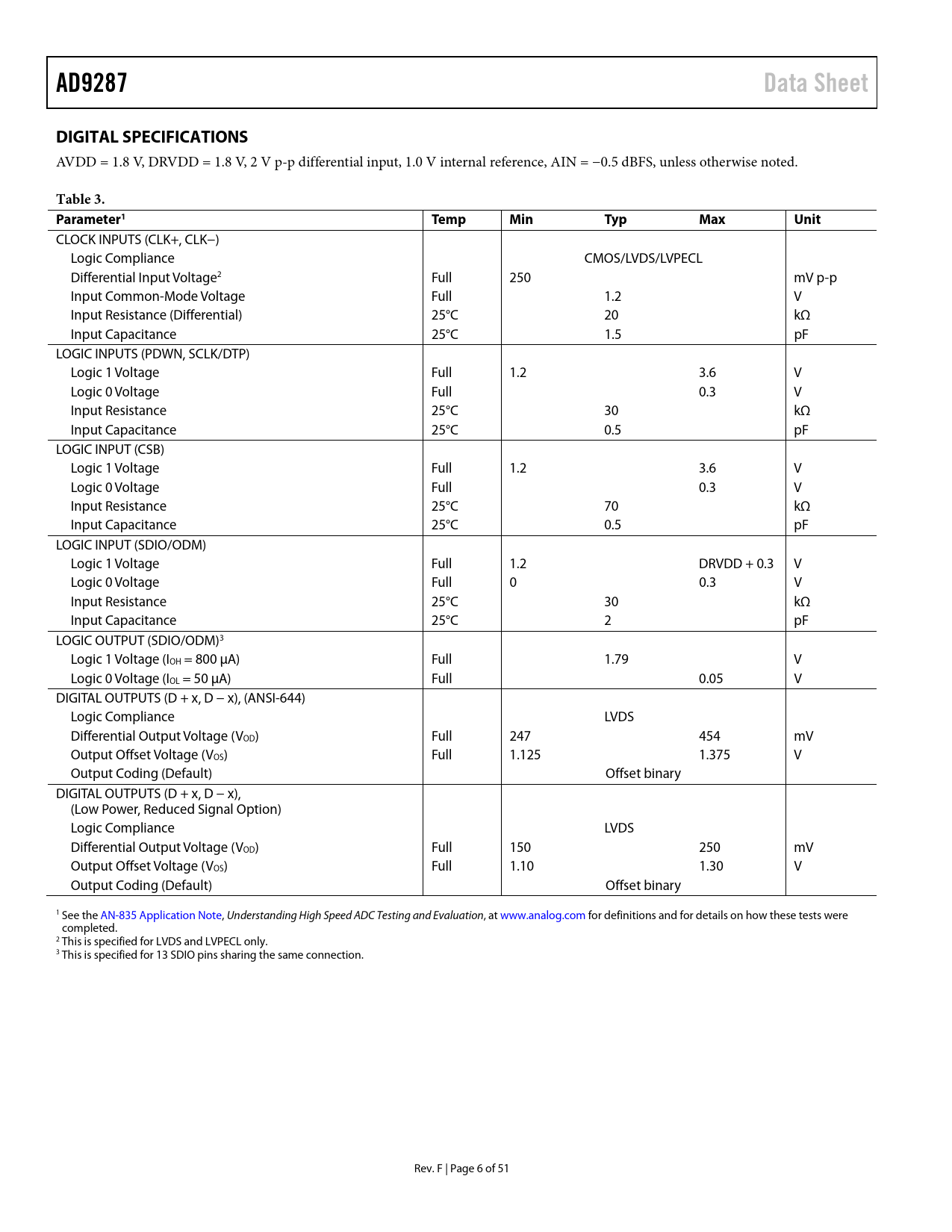 AD9287 Data Sheet DIGITAL SPECIFICATIONS Table 3 Parameter1 Temp Min Typ Max Unit