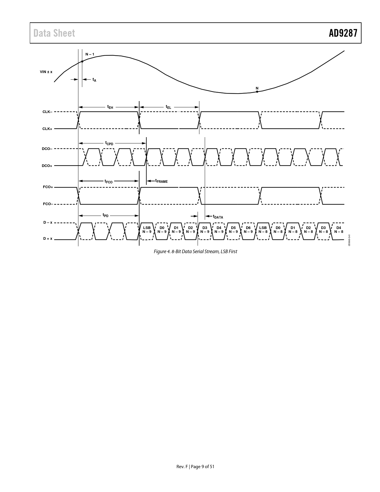 Data Sheet. AD9287. N – 1. VIN ± x. tEH. tEL. CLK–. CLK+. tCPD. DCO–. DCO+. FCO. FRAME. FCO+. FCO–. tPD. tDATA. D – x. LSB. N – 9. N – 8. D + x