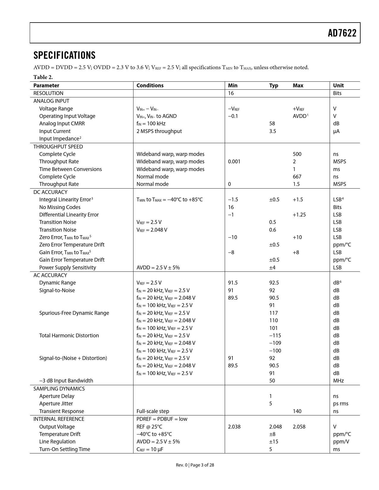 link to page 5 link to page 5 link to page 5 link to page 5 link to page 5 link to page 5 link to page 5 AD7622SPECIFICATIONS AVDD = DVDD = 2.5 V; OVDD = 2.3 V to 3.6 V; VREF = 2.5 V; all specifications TMIN to TMAX, unless otherwise noted. Table 2. Parameter ConditionsMinTypMaxUnit RESOLUTION 16 Bits ANALOG INPUT Voltage Range VIN+ − VIN− −VREF +VREF V Operating Input Voltage VIN+, VIN− to AGND −0.1 AVDD1 V Analog Input CMRR fIN = 100 kHz 58 dB Input Current 2 MSPS throughput 3.5 μA Input Impedance2 THROUGHPUT SPEED Complete Cycle Wideband warp, warp modes 500 ns Throughput Rate Wideband warp, warp modes 0.001 2 MSPS Time Between Conversions Wideband warp, warp modes 1 ms Complete Cycle Normal mode 667 ns Throughput Rate Normal mode 0 1.5 MSPS DC ACCURACY Integral Linearity Error3 TMIN to TMAX = −40°C to +85°C −1.5 ±0.5 +1.5 LSB4 No Missing Codes 16 Bits Differential Linearity Error −1 +1.25 LSB Transition Noise VREF = 2.5 V 0.5 LSB Transition Noise VREF = 2.048 V 0.6 LSB Zero Error, T 5 MIN to TMAX −10 +10 LSB Zero Error Temperature Drift ±0.5 ppm/°C Gain Error, T 5 MIN to TMAX −8 +8 LSB Gain Error Temperature Drift ±0.5 ppm/°C Power Supply Sensitivity AVDD = 2.5 V ± 5% ±4 LSB AC ACCURACY Dynamic Range VREF = 2.5 V 91.5 92.5 dB6 Signal-to-Noise fIN = 20 kHz, VREF = 2.5 V 91 92 dB fIN = 20 kHz, VREF = 2.048 V 89.5 90.5 dB fIN = 100 kHz, VREF = 2.5 V 91 dB Spurious-Free Dynamic Range fIN = 20 kHz, VREF = 2.5 V 117 dB fIN = 20 kHz, VREF = 2.048 V 110 dB fIN = 100 kHz, VREF = 2.5 V 101 dB Total Harmonic Distortion fIN = 20 kHz, VREF = 2.5 V −115 dB fIN = 20 kHz, VREF = 2.048 V −109 dB fIN = 100 kHz, VREF = 2.5 V −100 dB Signal-to-(Noise + Distortion) fIN = 20 kHz, VREF = 2.5 V 91 92 dB fIN = 20 kHz, VREF = 2.048 V 89.5 90.5 dB fIN = 100 kHz, VREF = 2.5 V 91 dB −3 dB Input Bandwidth 50 MHz SAMPLING DYNAMICS Aperture Delay 1 ns Aperture Jitter 5 ps rms Transient Response Full-scale step 140 ns INTERNAL REFERENCE PDREF = PDBUF = low Output Voltage REF @ 25°C 2.038 2.048 2.058 V Temperature Drift −40°C to +85°C ±8 ppm/°C Line Regulation AVDD = 2.5 V ± 5% ±15 ppm/V Turn-On Settling Time CREF = 10 μF 5 ms Rev. 0 | Page 3 of 28 Document Outline FEATURES APPLICATIONS GENERAL DESCRIPTION FUNCTIONAL BLOCK DIAGRAM TABLE OF CONTENTS REVISION HISTORY SPECIFICATIONS ABSOLUTE MAXIMUM RATINGS ESD CAUTION TIMING SPECIFICATIONS PIN CONFIGURATION AND FUNCTION DESCRIPTIONS TERMINOLOGY TYPICAL PERFORMANCE CHARACTERISTICS APPLICATIONS INFORMATION CIRCUIT INFORMATION CONVERTER OPERATION MODES OF OPERATION TRANSFER FUNCTIONS TYPICAL CONNECTION DIAGRAM ANALOG INPUTS MULTIPLEXED INPUTS DRIVER AMPLIFIER CHOICE Single-to-Differential Driver VOLTAGE REFERENCE INPUT Internal Reference (PDBUF = Low, PDREF = Low) External 1.2 V Reference and Internal Buffer (PDBUF = Low, PDREF = High) External 2.5 V Reference (PDBUF = High, PDREF = High) Reference Decoupling Temperature Sensor POWER SUPPLY Power Sequencing Power-Up CONVERSION CONTROL INTERFACES DIGITAL INTERFACE RESET PARALLEL INTERFACE Master Parallel Interface Slave Parallel Interface 8-Bit Interface (Master or Slave) SERIAL INTERFACE MASTER SERIAL INTERFACE Internal Clock SLAVE SERIAL INTERFACE External Clock External Discontinuous Clock Data Read After Conversion External Clock Data Read During Previous Conversion MICROPROCESSOR INTERFACING SPI Interface (ADSP-219x) APPLICATION HINTS LAYOUT EVALUATING THE AD7622 PERFORMANCE OUTLINE DIMENSIONS ORDERING GUIDE