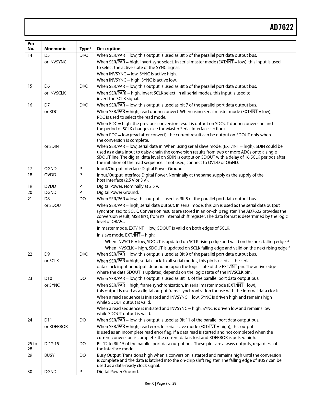 link to page 23 link to page 11 link to page 11 link to page 11 AD7622Pin No. Mnemonic Type 1 Description 14 D5 DI/O When SER/PAR = low, this output is used as Bit 5 of the parallel port data output bus. or INVSYNC When SER/PAR = high, invert sync select. In serial master mode (EXT/INT = low), this input is used to select the active state of the SYNC signal. When INVSYNC = low, SYNC is active high. When INVSYNC = high, SYNC is active low. 15 D6 DI/O When SER/PAR = low, this output is used as Bit 6 of the parallel port data output bus. or INVSCLK When SER/PAR] = high, invert SCLK select. In all serial modes, this input is used to invert the SCLK signal. 16 D7 DI/O When SER/PAR = low, this output is used as bit 7 of the parallel port data output bus. or RDC When SER/PAR = high, read during convert. When using serial master mode (EXT/INT = low), RDC is used to select the read mode. When RDC = high, the previous conversion result is output on SDOUT during conversion and the period of SCLK changes (see the Master Serial Interface section). When RDC = low (read after convert), the current result can be output on SDOUT only when the conversion is complete. or SDIN When SER/PAR = low, serial data in. When using serial slave mode, (EXT/INT = high), SDIN could be used as a data input to daisy-chain the conversion results from two or more ADCs onto a single SDOUT line. The digital data level on SDIN is output on SDOUT with a delay of 16 SCLK periods after the initiation of the read sequence. If not used, connect to OVDD or OGND. 17 OGND P Input/Output Interface Digital Power Ground. 18 OVDD P Input/Output Interface Digital Power. Nominally at the same supply as the supply of the host interface (2.5 V or 3 V). 19 DVDD P Digital Power. Nominally at 2.5 V. 20 DGND P Digital Power Ground. 21 D8 DO When SER/PAR = low, this output is used as Bit 8 of the parallel port data output bus. or SDOUT When SER/PAR = high, serial data output. In serial mode, this pin is used as the serial data output synchronized to SCLK. Conversion results are stored in an on-chip register. The AD7622 provides the conversion result, MSB first, from its internal shift register. The data format is determined by the logic level of OB/2C. In master mode, EXT/INT = low, SDOUT is valid on both edges of SCLK. In slave mode, EXT/INT = high: When INVSCLK = low, SDOUT is updated on SCLK rising edge and valid on the next falling edge. 2 When INVSCLK = high, SDOUT is updated on SCLK falling edge and valid on the next rising edge.2 22 D9 DI/O When SER/PAR = low, this output is used as Bit 9 of the parallel port data output bus. or SCLK When SER/PAR = high, serial clock. In all serial modes, this pin is used as the serial data clock input or output, depending upon the logic state of the EXT/INT pin. The active edge where the data SDOUT is updated, depends on the logic state of the INVSCLK pin. 23 D10 DO When SER/PAR = low, this output is used as Bit 10 of the parallel port data output bus. or SYNC When SER/PAR = high, frame synchronization. In serial master mode (EXT/INT= low), this output is used as a digital output frame synchronization for use with the internal data clock. When a read sequence is initiated and INVSYNC = low, SYNC is driven high and remains high while SDOUT output is valid. When a read sequence is initiated and INVSYNC = high, SYNC is driven low and remains low while SDOUT output is valid. 24 D11 DO When SER/PAR = low, this output is used as Bit 11 of the parallel port data output bus. or RDERROR When SER/PAR = high, read error. In serial slave mode (EXT/INT = high), this output is used as an incomplete read error flag. If a data read is started and not completed when the current conversion is complete, the current data is lost and RDERROR is pulsed high. 25 to D[12:15] DO Bit 12 to Bit 15 of the parallel port data output bus. These pins are always outputs, regardless of 28 the interface mode. 29 BUSY DO Busy Output. Transitions high when a conversion is started and remains high until the conversion is complete and the data is latched into the on-chip shift register. The falling edge of BUSY can be used as a data-ready clock signal. 30 DGND P Digital Power Ground. Rev. 0 | Page 9 of 28 Document Outline FEATURES APPLICATIONS GENERAL DESCRIPTION FUNCTIONAL BLOCK DIAGRAM TABLE OF CONTENTS REVISION HISTORY SPECIFICATIONS ABSOLUTE MAXIMUM RATINGS ESD CAUTION TIMING SPECIFICATIONS PIN CONFIGURATION AND FUNCTION DESCRIPTIONS TERMINOLOGY TYPICAL PERFORMANCE CHARACTERISTICS APPLICATIONS INFORMATION CIRCUIT INFORMATION CONVERTER OPERATION MODES OF OPERATION TRANSFER FUNCTIONS TYPICAL CONNECTION DIAGRAM ANALOG INPUTS MULTIPLEXED INPUTS DRIVER AMPLIFIER CHOICE Single-to-Differential Driver VOLTAGE REFERENCE INPUT Internal Reference (PDBUF = Low, PDREF = Low) External 1.2 V Reference and Internal Buffer (PDBUF = Low, PDREF = High) External 2.5 V Reference (PDBUF = High, PDREF = High) Reference Decoupling Temperature Sensor POWER SUPPLY Power Sequencing Power-Up CONVERSION CONTROL INTERFACES DIGITAL INTERFACE RESET PARALLEL INTERFACE Master Parallel Interface Slave Parallel Interface 8-Bit Interface (Master or Slave) SERIAL INTERFACE MASTER SERIAL INTERFACE Internal Clock SLAVE SERIAL INTERFACE External Clock External Discontinuous Clock Data Read After Conversion External Clock Data Read During Previous Conversion MICROPROCESSOR INTERFACING SPI Interface (ADSP-219x) APPLICATION HINTS LAYOUT EVALUATING THE AD7622 PERFORMANCE OUTLINE DIMENSIONS ORDERING GUIDE