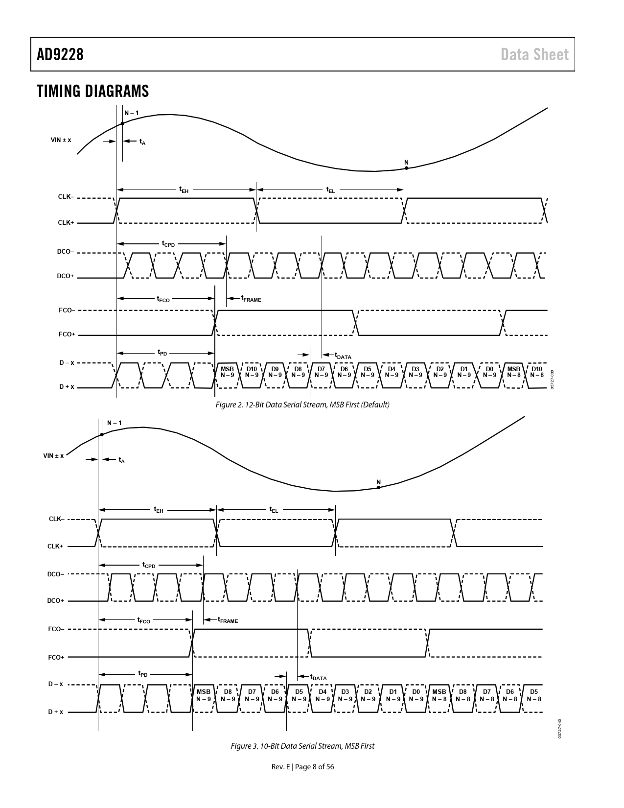 AD9228. Data Sheet. TIMING DIAGRAMS. N – 1. VIN ± x. tEH. tEL. CLK–. CLK+. tCPD. DCO–. DCO+. FCO. FRAME. FCO–. FCO+. tPD. tDATA. D – x. MSB. D10. N – 9. N – 8. D + x