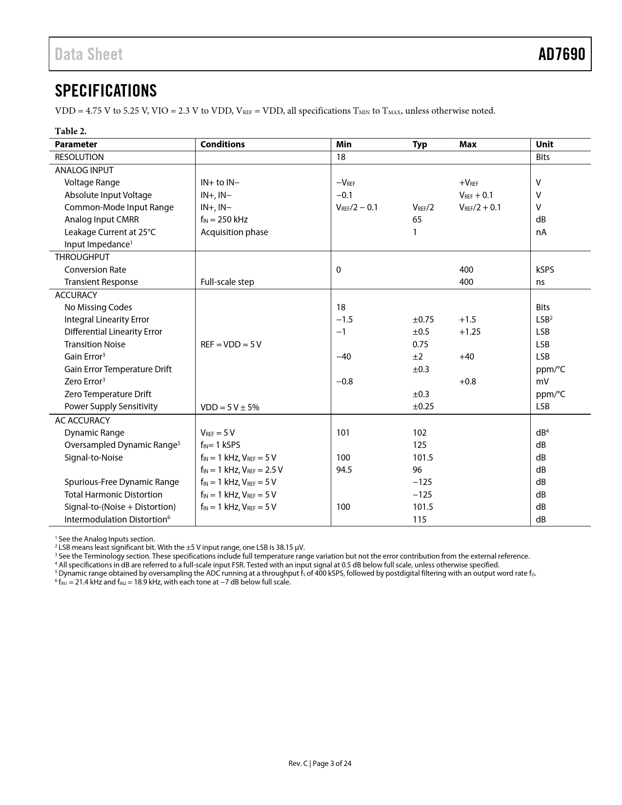 Data Sheet AD7690 SPECIFICATIONS Table 2 Parameter Conditions Min Typ Max Unit