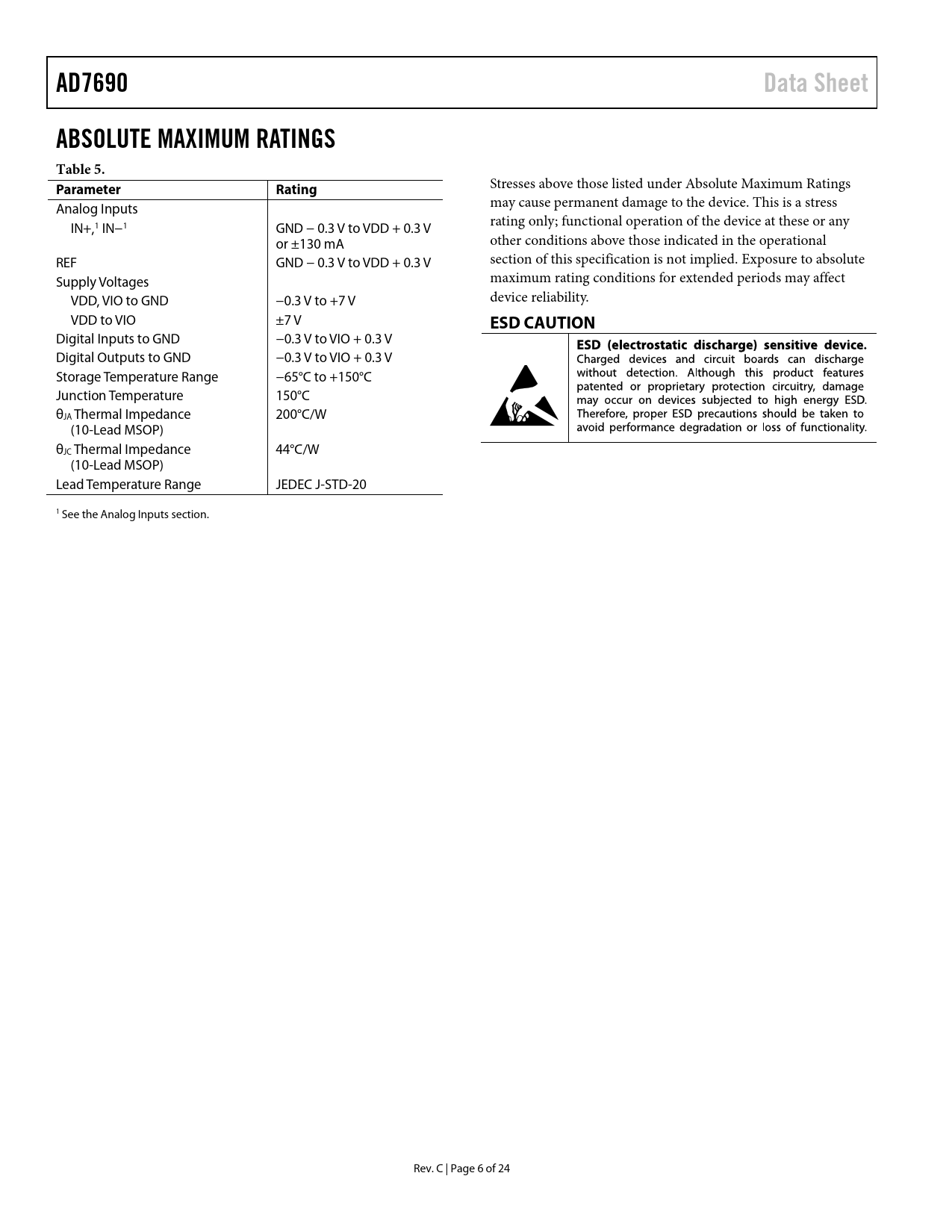 AD7690. Data Sheet. ABSOLUTE MAXIMUM RATINGS Table 5. Parameter. Rating. ESD CAUTION