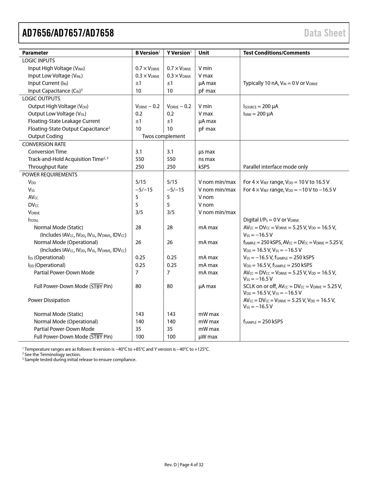 link to page 18 link to page 4 link to page 4 link to page 4 link to page 4 link to page 4 link to page 4 AD7656/AD7657/AD7658Data SheetParameterB Version 1 Y Version 1 UnitTest Conditions/Comments LOGIC INPUTS Input High Voltage (VINH) 0.7 × VDRIVE 0.7 × VDRIVE V min Input Low Voltage (VINL) 0.3 × VDRIVE 0.3 × VDRIVE V max Input Current (IIN) ±1 ±1 µA max Typically 10 nA, VIN = 0 V or VDRIVE Input Capacitance (CIN)3 10 10 pF max LOGIC OUTPUTS Output High Voltage (VOH) VDRIVE − 0.2 VDRIVE − 0.2 V min ISOURCE = 200 µA Output Low Voltage (VOL) 0.2 0.2 V max ISINK = 200 µA Floating-State Leakage Current ±1 ±1 µA max Floating-State Output Capacitance3 10 10 pF max Output Coding Twos complement CONVERSION RATE Conversion Time 3.1 3.1 µs max Track-and-Hold Acquisition Time2, 3 550 550 ns max Throughput Rate 250 250 kSPS Parallel interface mode only POWER REQUIREMENTS VDD 5/15 5/15 V nom min/max For 4 × VREF range, VDD = 10 V to 16.5 V VSS −5/−15 −5/−15 V nom min/max For 4 × VREF range, VDD = −10 V to −16.5 V AVCC 5 5 V nom DVCC 5 5 V nom VDRIVE 3/5 3/5 V nom min/max ITOTAL Digital I/PS = 0 V or VDRIVE Normal Mode (Static) 28 28 mA max AVCC = DVCC = VDRIVE = 5.25 V, VDD = 16.5 V, (Includes IAVCC, IVDD, IVSS, IVDRIVE, IDVCC) VSS = −16.5 V Normal Mode (Operational) 26 26 mA max fSAMPLE = 250 kSPS, AVCC = DVCC = VDRIVE = 5.25 V, (Includes IAVCC, IVDD, IVSS, IVDRIVE, IDVCC) VDD = 16.5 V, VSS = −16.5 V ISS (Operational) 0.25 0.25 mA max VSS = −16.5 V, fSAMPLE = 250 kSPS IDD (Operational) 0.25 0.25 mA max VDD = 16.5 V, fSAMPLE = 250 kSPS Partial Power-Down Mode 7 7 mA max AVCC = DVCC = VDRIVE = 5.25 V, VDD = 16.5 V, VSS = −16.5 V Full Power-Down Mode (STBY Pin) 80 80 µA max SCLK on or off, AVCC = DVCC = VDRIVE = 5.25 V, VDD = 16.5 V, VSS = −16.5 V Power Dissipation AVCC = DVCC = VDRIVE = 5.25 V, VDD = 16.5 V, VSS = −16.5 V Normal Mode (Static) 143 143 mW max Normal Mode (Operational) 140 140 mW max fSAMPLE = 250 kSPS Partial Power-Down Mode 35 35 mW max Full Power-Down Mode (STBY Pin) 100 100 µW max 1 Temperature ranges are as follows: B version is −40°C to +85°C and Y version is −40°C to +125°C. 2 See the Terminology section. 3 Sample tested during initial release to ensure compliance. Rev. D | Page 4 of 32 Document Outline Features Applications Functional Block Diagram General Description Product Highlights Table of Contents Revision History Specifications AD7656 AD7657 AD7658 Timing Specifications Absolute Maximum Ratings Thermal Resistance ESD Caution Pin Configuration and Function Descriptions Typical Performance Characteristics Terminology Theory of Operation Converter Details Track-and-Hold Section Analog Input Section ADC Transfer Function Reference Section Typical Connection Diagram Driving the Analog Inputs Interface Section Parallel Interface (SER/ = 0) Software Selection of ADCs Changing the Analog Input Range (/S SEL = 0) Changing the Analog Input Range (/S SEL = 1) Serial Interface (SER/ = 1) Serial Read Operation Daisy-Chain Mode (DCEN = 1, SER/ = 1) Standby/Partial Power-Down Modes of Operation Application Hints Layout Power Supply Configuration Outline Dimensions Ordering Guide