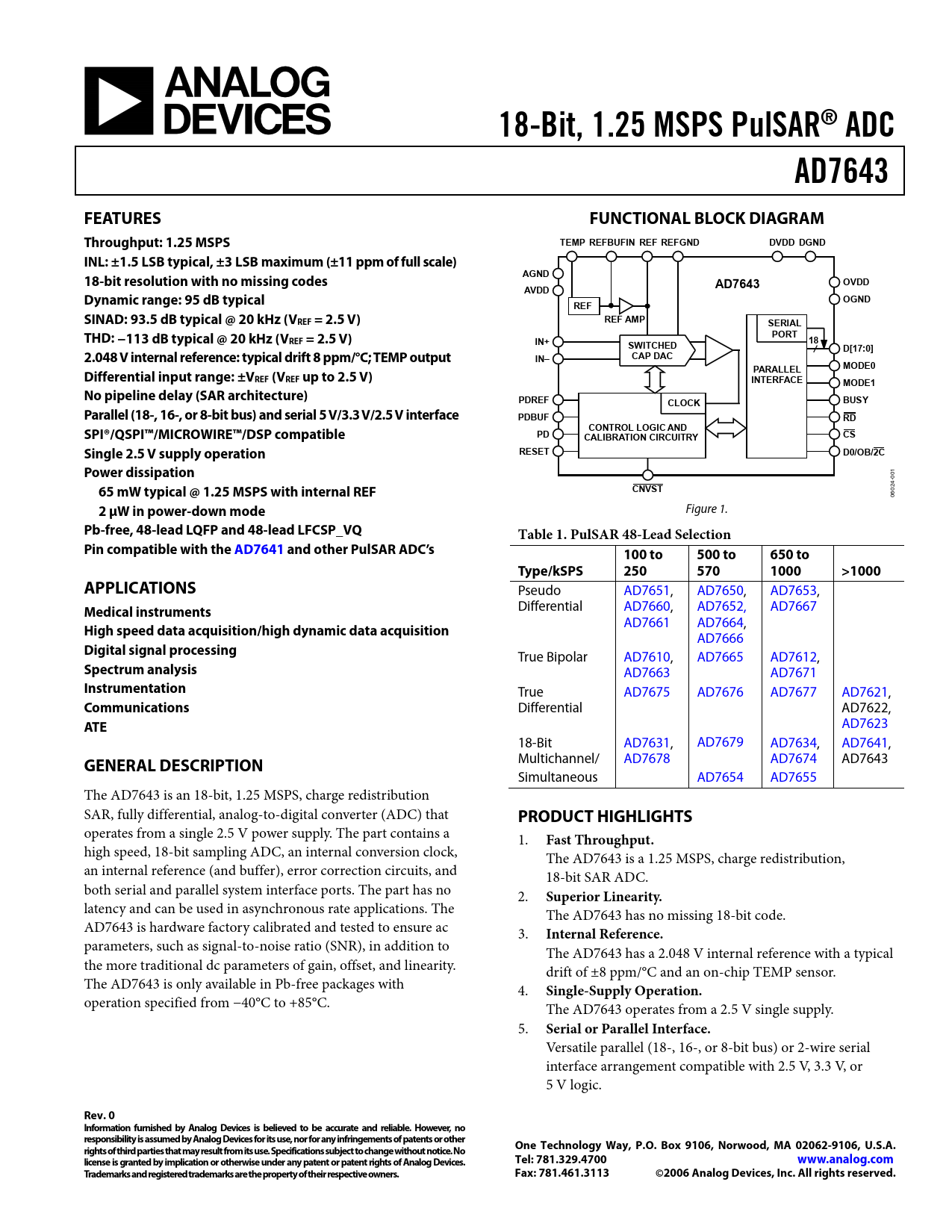 high speed, 18-bit sampling ADC, an internal conversion clock, The AD7643 is a 1.25 MSPS, charge redistribution, an internal reference (and buffer), error correction circuits, and 18-bit SAR ADC. both serial and parallel system interface ports. The part has no 2.