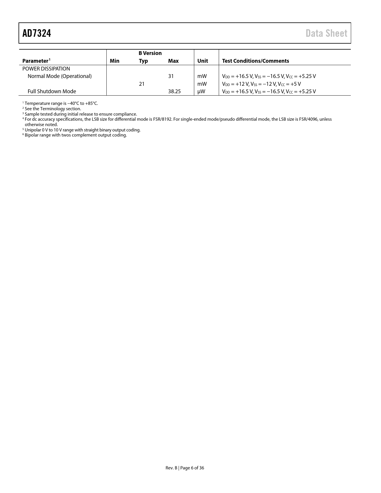 AD7324 Data Sheet B Version Parameter1 Min Typ Max Unit Test Conditions/Comments