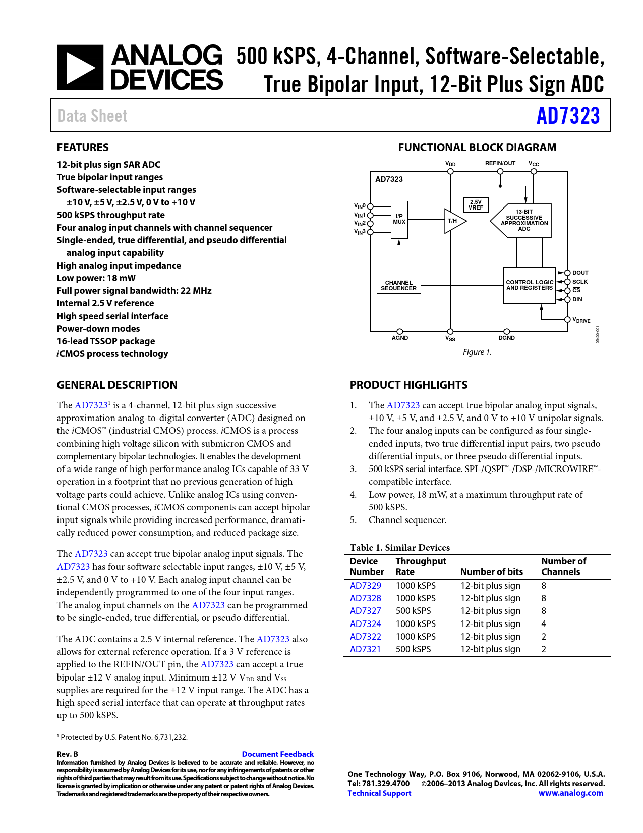 ±2.5 V, and 0 V to +10 V. Each analog input channel can be AD7329 1000 kSPS 12-bit plus sign 8 independently programmed to one of the four input ranges. AD7328 1000 kSPS 12-bit plus sign 8 The analog input channels on the AD7323 can be programmed AD7327 500 kSPS 12-bit plus sign 8 to be single-ended, true differential, or pseudo differential. AD7324 1000 kSPS 12-bit plus sign 4 The ADC contains a 2.5 V internal reference. The AD7323 also AD7322 1000 kSPS 12-bit plus sign 2 allows for external reference operation. If a 3 V reference is AD7321 500 kSPS 12-bit plus sign 2 applied to the REFIN/OUT pin, the AD7323 can accept a true bipolar ±12 V analog input. Minimum ±12 V VDD and VSS supplies are required for the ±12 V input range. The ADC has a high speed serial interface that can operate at throughput rates up to 500 kSPS. 1 Protected by U.S. Patent No. 6,731,232.