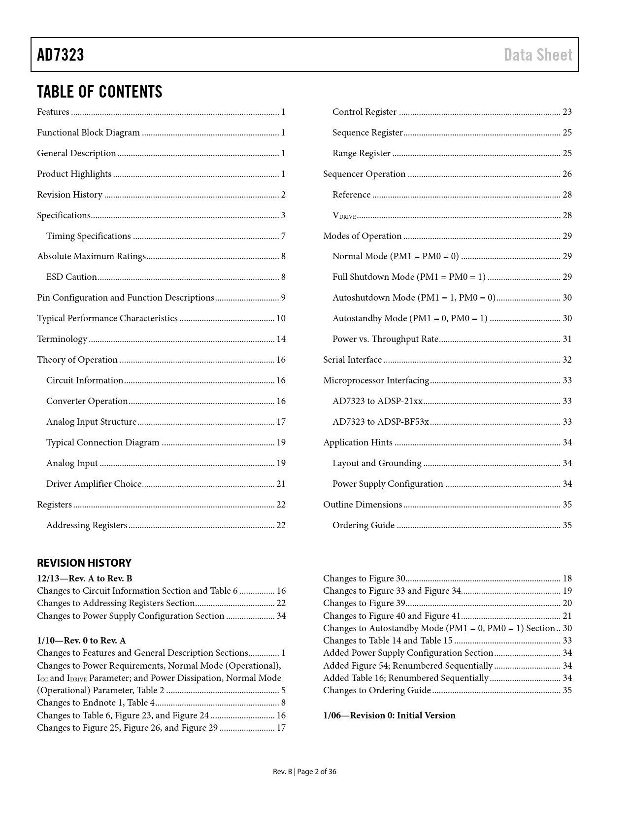 link to page 1 link to page 1 link to page 1 link to page 1 link to page 3 link to page 4 link to page 8 link to page 9 link to page 9 link to page 10 link to page 11 link to page 15 link to page 17 link to page 17 link to page 17 link to page 18 link to page 20 link to page 20 link to page 22 link to page 23 link to page 23 link to page 24 link to page 26 link to page 26 link to page 27 link to page 29 link to page 29 link to page 30 link to page 30 link to page 30 link to page 31 link to page 31 link to page 32 link to page 33 link to page 34 link to page 34 link to page 34 link to page 35 link to page 35 link to page 35 link to page 36 link to page 36 AD7323Data SheetTABLE OF CONTENTS Features .. 1 Control Register ... 23 Functional Block Diagram .. 1 Sequence Register ... 25 General Description ... 1 Range Register .. 25 Product Highlights ... 1 Sequencer Operation ... 26 Revision History ... 2 Reference ... 28 Specifications ... 3 VDRIVE .. 28 Timing Specifications .. 7 Modes of Operation ... 29 Absolute Maximum Ratings .. 8 Normal Mode (PM1 = PM0 = 0) ... 29 ESD Caution .. 8 Full Shutdown Mode (PM1 = PM0 = 1) ... 29 Pin Configuration and Function Descriptions ... 9 Autoshutdown Mode (PM1 = 1, PM0 = 0) ... 30 Typical Performance Characteristics ... 10 Autostandby Mode (PM1 = 0, PM0 = 1) .. 30 Terminology .. 14 Power vs. Throughput Rate ... 31 Theory of Operation .. 16 Serial Interface .. 32 Circuit Information .. 16 Microprocessor Interfacing ... 33 Converter Operation .. 16 AD7323 to ADSP-21xx .. 33 Analog Input Structure .. 17 AD7323 to ADSP-BF53x ... 33 Typical Connection Diagram ... 19 Application Hints ... 34 Analog Input ... 19 Layout and Grounding .. 34 Driver Amplifier Choice .. 21 Power Supply Configuration .. 34 Registers ... 22 Outline Dimensions ... 35 Addressing Registers .. 22 Ordering Guide .. 35 REVISION HISTORY 12/13—Rev. A to Rev. B Changes to Figure 30 .. 18 Changes to Circuit Information Section and Table 6 .. 16 Changes to Figure 33 and Figure 34... 19 Changes to Addressing Registers Section .. 22 Changes to Figure 39 .. 20 Changes to Power Supply Configuration Section .. 34 Changes to Figure 40 and Figure 41... 21 Changes to Autostandby Mode (PM1 = 0, PM0 = 1) Section .. 30 1/10—Rev. 0 to Rev. A Changes to Table 14 and Table 15 .. 33 Changes to Features and General Description Sections .. 1 Added Power Supply Configuration Section .. 34 Changes to Power Requirements, Normal Mode (Operational), Added Figure 54; Renumbered Sequentially .. 34 ICC and IDRIVE Parameter; and Power Dissipation, Normal Mode Added Table 16; Renumbered Sequentially .. 34 (Operational) Parameter, Table 2 ... 5 Changes to Ordering Guide .. 35 Changes to Endnote 1, Table 4 .. 8 Changes to Table 6, Figure 23, and Figure 24 ... 16 1/06—Revision 0: Initial Version Changes to Figure 25, Figure 26, and Figure 29 ... 17 Rev. B | Page 2 of 36 Document Outline Features Functional Block Diagram General Description Product Highlights Table of Contents Revision History Specifications Timing Specifications Absolute Maximum Ratings ESD Caution Pin Configuration and Function Descriptions Typical Performance Characteristics Terminology Theory of Operation Circuit Information Converter Operation Output Coding Transfer Functions Analog Input Structure Track-and-Hold Section Typical Connection Diagram Analog Input Single-Ended Inputs True Differential Mode Pseudo Differential Inputs Driver Amplifier Choice Registers Addressing Registers Control Register Sequence Register Range Register Sequencer Operation Reference VDRIVE Modes of Operation Normal Mode (PM1 = PM0 = 0) Full Shutdown Mode (PM1 = PM0 = 1) Autoshutdown Mode (PM1 = 1, PM0 = 0) Autostandby Mode (PM1 = 0, PM0 = 1) Power vs. Throughput Rate Serial Interface Microprocessor Interfacing AD7323 to ADSP-21xx AD7323 to ADSP-BF53x Application Hints Layout and Grounding Power Supply Configuration Outline Dimensions Ordering Guide
