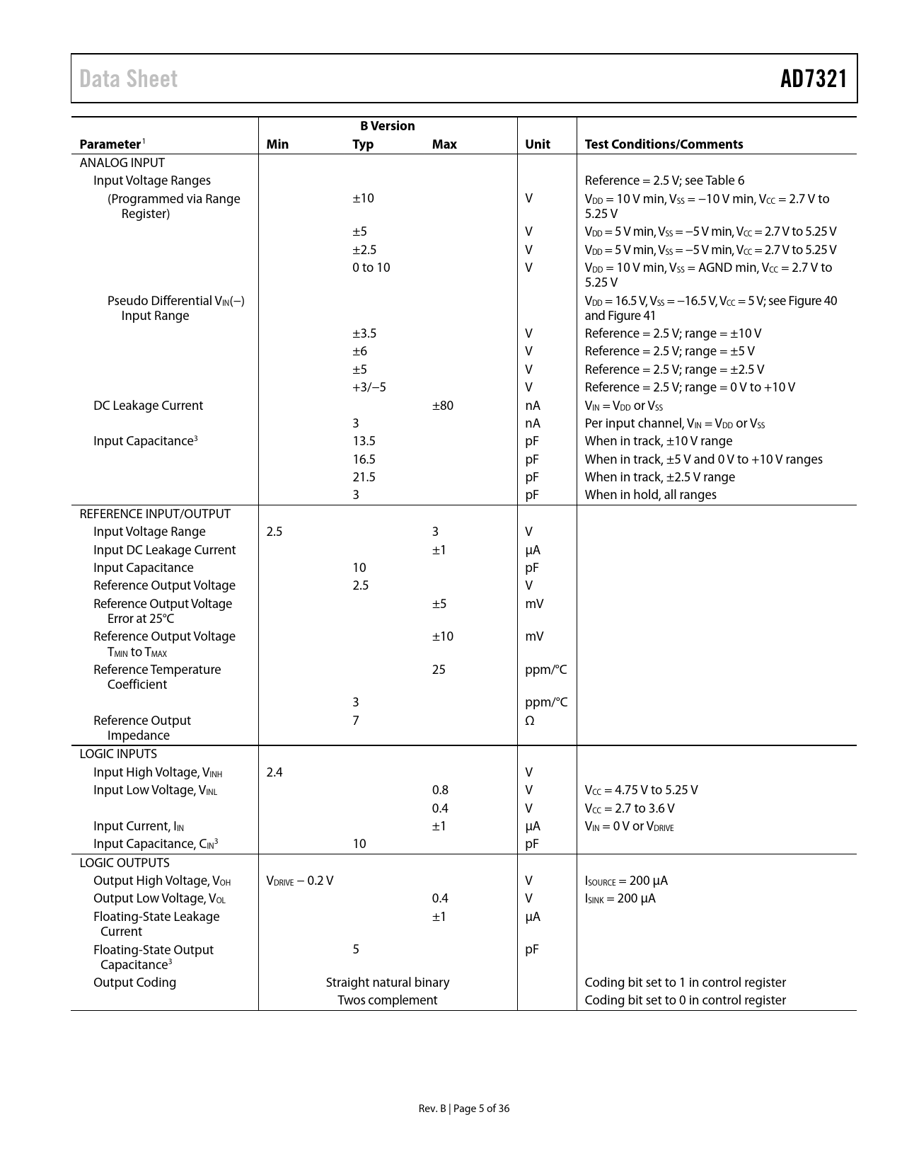 Data Sheet AD7321 B Version Parameter Min Typ Max Unit Test Conditions/Comments