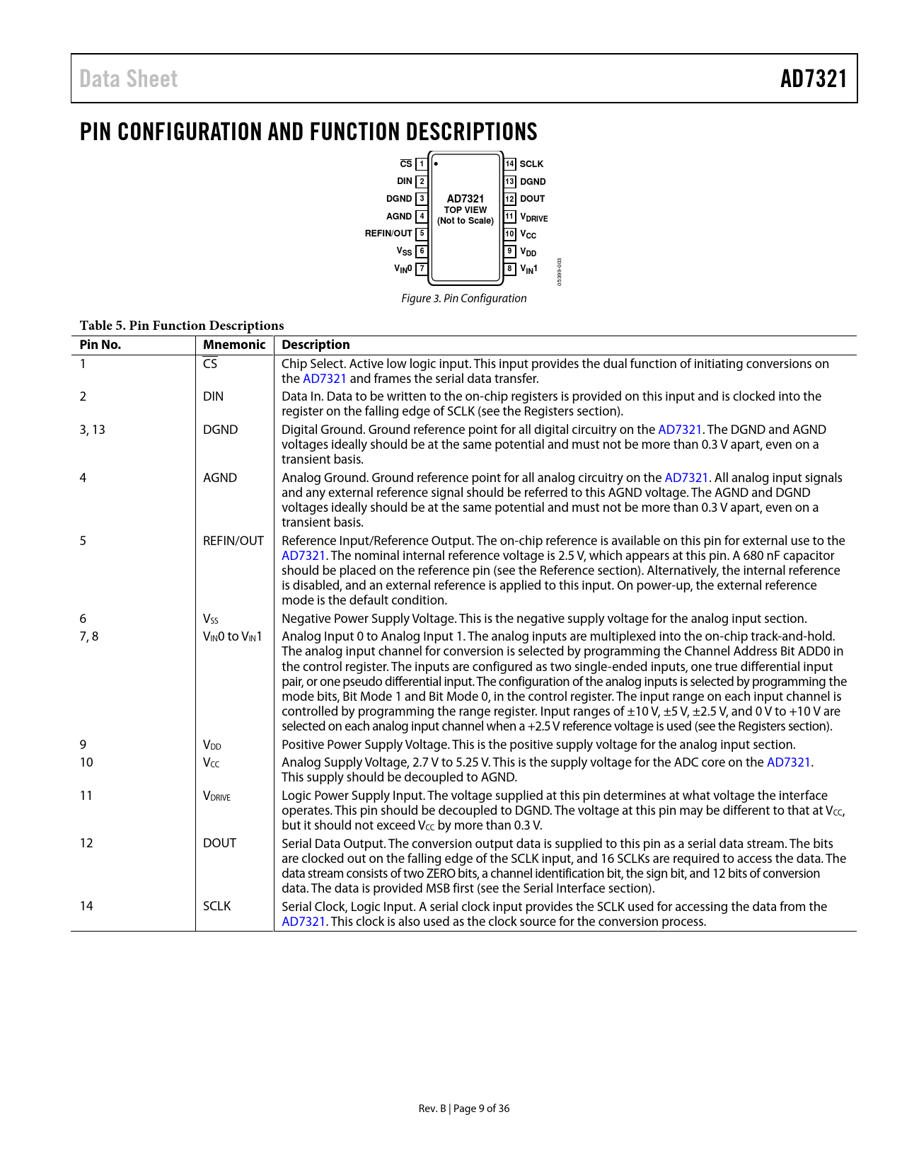 Data Sheet. AD7321. PIN CONFIGURATION AND FUNCTION DESCRIPTIONS. CS 1. 14 SCLK. DIN 2. 13 DGND. DGND 3. 12 DOUT. TOP VIEW. AGND 4. 11 VDRIVE