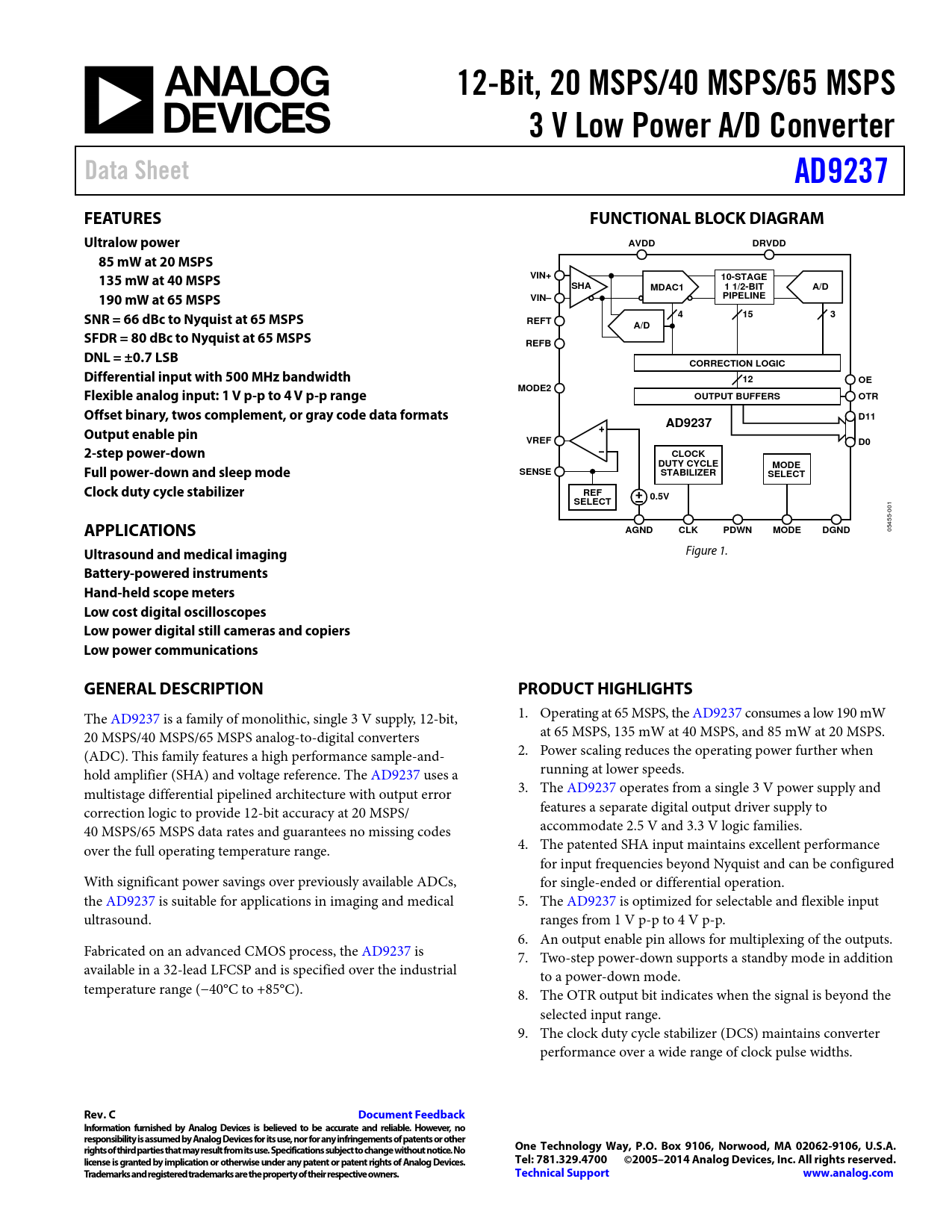 12-Bit, 20 MSPS/40 MSPS/65 MSPS. 3 V Low Power A/D Converter. Data Sheet. AD9237. FEATURES. FUNCTIONAL BLOCK DIAGRAM