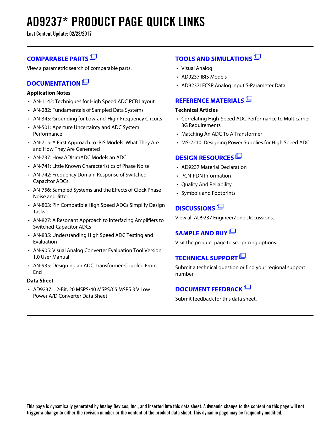 AD9237* PRODUCT PAGE QUICK LINKS Last Content Update: 02/23/2017COMPARABLE PARTSTOOLS AND SIMULATIONS View a parametric search of comparable parts. • Visual Analog • AD9237 IBIS Models DOCUMENTATION • AD9237LFCSP Analog Input S-Parameter Data Application Notes • AN-1142: Techniques for High Speed ADC PCB Layout REFERENCE MATERIALS • AN-282: Fundamentals of Sampled Data Systems Technical Articles • AN-345: Grounding for Low-and-High-Frequency Circuits • Correlating High-Speed ADC Performance to Multicarrier • AN-501: Aperture Uncertainty and ADC System 3G Requirements Performance • Matching An ADC To A Transformer • AN-715: A First Approach to IBIS Models: What They Are • MS-2210: Designing Power Supplies for High Speed ADC and How They Are Generated • AN-737: How ADIsimADC Models an ADC DESIGN RESOURCES • AN-741: Little Known Characteristics of Phase Noise • AD9237 Material Declaration • AN-742: Frequency Domain Response of Switched- • PCN-PDN Information Capacitor ADCs • Quality And Reliability • AN-756: Sampled Systems and the Effects of Clock Phase • Symbols and Footprints Noise and Jitter • AN-803: Pin Compatible High Speed ADCs Simplify Design DISCUSSIONS Tasks • AN-827: A Resonant Approach to Interfacing Amplifiers to View all AD9237 EngineerZone Discussions. Switched-Capacitor ADCs • AN-835: Understanding High Speed ADC Testing and SAMPLE AND BUY Evaluation Visit the product page to see pricing options. • AN-905: Visual Analog Converter Evaluation Tool Version 1.0 User Manual TECHNICAL SUPPORT • AN-935: Designing an ADC Transformer-Coupled Front Submit a technical question or find your regional support End number. Data Sheet • AD9237: 12-Bit, 20 MSPS/40 MSPS/65 MSPS 3 V Low DOCUMENT FEEDBACK Power A/D Converter Data Sheet Submit feedback for this data sheet. This page is dynamically generated by Analog Devices, Inc., and inserted into this data sheet. A dynamic change to the content on this page will not trigger a change to either the revision number or the content of the product data sheet. This dynamic page may be frequently modified. Document Outline Features Applications Functional Block Diagram General Description Product Highlights Table of Contents Revision History Specifications DC Specifications Digital Specifications AC Specifications Switching Specifications Timing Diagram Absolute Maximum Ratings ESD Caution Pin Configuration and Function Descriptions Terminology Equivalent Circuits Typical Performance Characteristics Applying the AD9237 Theory of Operation Analog Input and Reference Overview Differential Input Configurations Single-Ended Input Configuration Voltage Reference Internal Reference Connection External Reference Operation Clock Input Considerations Power Dissipation, Power Scaling, and Standby Mode Digital Outputs Operational Mode Selection Out of Range (OTR) Digital Output Enable Function (OE) Timing Outline Dimensions Ordering Guide