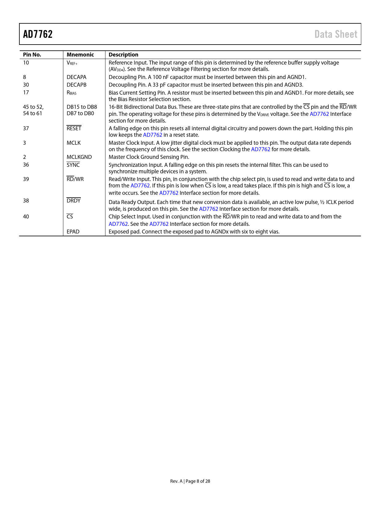 AD7762. Data Sheet. Pin No. Mnemonic. Description