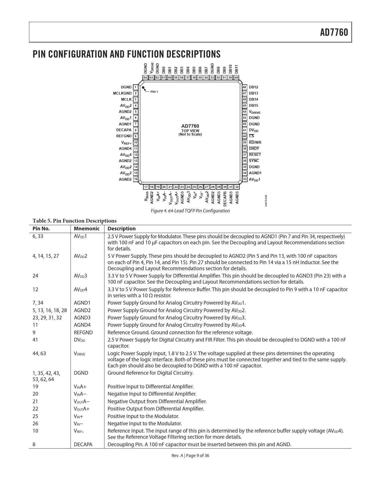AD7760 PIN CONFIGURATION AND FUNCTION DESCRIPTIONS DEDDNIV01RN01234567N8911GDGBBBBBBBBGBBBBDVDDDDDDDDDDDDDD64 63 6261 60 59 5857 56 55 54 53 52 51 50 49DGND 148DB12MCLKGND 2PIN 147 DB13MCLK 346DB14AV445 DB15DD2AGND2 544 VDRIVEAV643 DGNDDD1AGND1 742 DGNDAD7760DECAPA 841 DVTOP VIEWDDREFGND(Not to Scale)940CSV1039 RD/WRREF+AGND4 1138 DRDYAV1237 RESETDD4AGND2 1336 SYNCAV1435 DGNDDD2AV1534 AGND1DD2AGND2 1633 AVDD117 18 1920 21 22 23 24 25 26 27 28 29 30 31 32S2+––+33+–223B33IADAAAADDININDDDPDD 5 BNININTTNDVVDNNANN 0 RGVVUUGVVGG -0 CGG 5 AOOAA 7 VVAAAEAA 9 D 4 0 Figure 4. 64-Lead TQFP Pin Configuration Table 5. Pin Function Descriptions Pin No.MnemonicDescription 6, 33 AVDD1 2.5 V Power Supply for Modulator. These pins should be decoupled to AGND1 (Pin 7 and Pin 34, respectively) with 100 nF and 10 µF capacitors on each pin. See the Decoupling and Layout Recommendations section for details. 4, 14, 15, 27 AVDD2 5 V Power Supply. These pins should be decoupled to AGND2 (Pin 5 and Pin 13, with 100 nF capacitors on each of Pin 4, Pin 14, and Pin 15). Pin 27 should be connected to Pin 14 via a 15 nH inductor. See the Decoupling and Layout Recommendations section for details. 24 AVDD3 3.3 V to 5 V Power Supply for Differential Amplifier. This pin should be decoupled to AGND3 (Pin 23) with a 100 nF capacitor. See the Decoupling and Layout Recommendations section for details. 12 AVDD4 3.3 V to 5 V Power Supply for Reference Buffer. This pin should be decoupled to Pin 9 with a 10 nF capacitor in series with a 10 Ω resistor. 7, 34 AGND1 Power Supply Ground for Analog Circuitry Powered by AVDD1. 5, 13, 16, 18, 28 AGND2 Power Supply Ground for Analog Circuitry Powered by AVDD2. 23, 29, 31, 32 AGND3 Power Supply Ground for Analog Circuitry Powered by AVDD3. 11 AGND4 Power Supply Ground for Analog Circuitry Powered by AVDD4. 9 REFGND Reference Ground. Ground connection for the reference voltage. 41 DVDD 2.5 V Power Supply for Digital Circuitry and FIR Filter. This pin should be decoupled to DGND with a 100 nF capacitor. 44, 63 VDRIVE Logic Power Supply Input, 1.8 V to 2.5 V. The voltage supplied at these pins determines the operating voltage of the logic interface. Both of these pins must be connected together and tied to the same supply. Each pin should also be decoupled to DGND with a 100 nF capacitor. 1, 35, 42, 43, DGND Ground Reference for Digital Circuitry. 53, 62, 64 19 VINA+ Positive Input to Differential Amplifier. 20 VINA− Negative Input to Differential Amplifier. 21 VOUTA− Negative Output from Differential Amplifier. 22 VOUTA+ Positive Output from Differential Amplifier. 25 VIN+ Positive Input to the Modulator. 26 VIN− Negative Input to the Modulator. 10 VREF+ Reference Input. The input range of this pin is determined by the reference buffer supply voltage (AVDD4). See the Reference Voltage Filtering section for more details. 8 DECAPA Decoupling Pin. A 100 nF capacitor must be inserted between this pin and AGND. Rev. A | Page 9 of 36