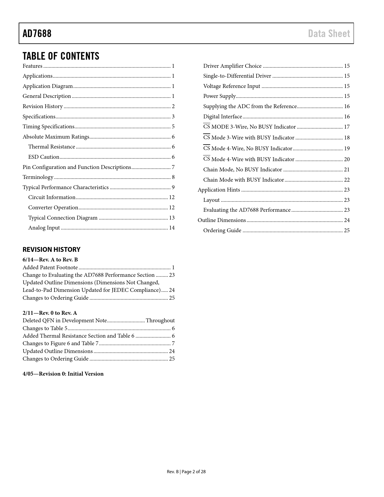 AD7688 Data Sheet TABLE OF CONTENTS REVISION HISTORY 6/14—Rev A to Rev B 2/11—Rev 0 to Rev A