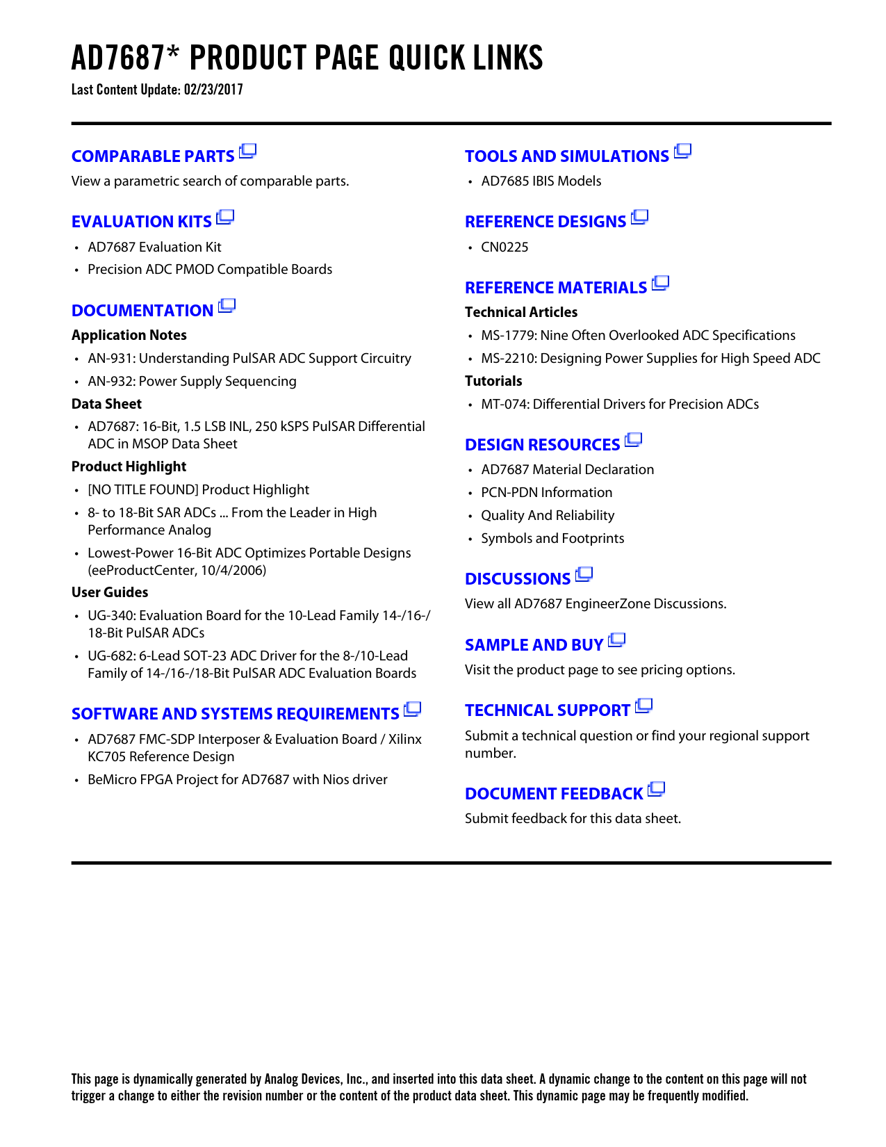 AD7687* PRODUCT PAGE QUICK LINKS Last Content Update: 02/23/2017. COMPARABLE PARTS. TOOLS AND SIMULATIONS. EVALUATION KITS