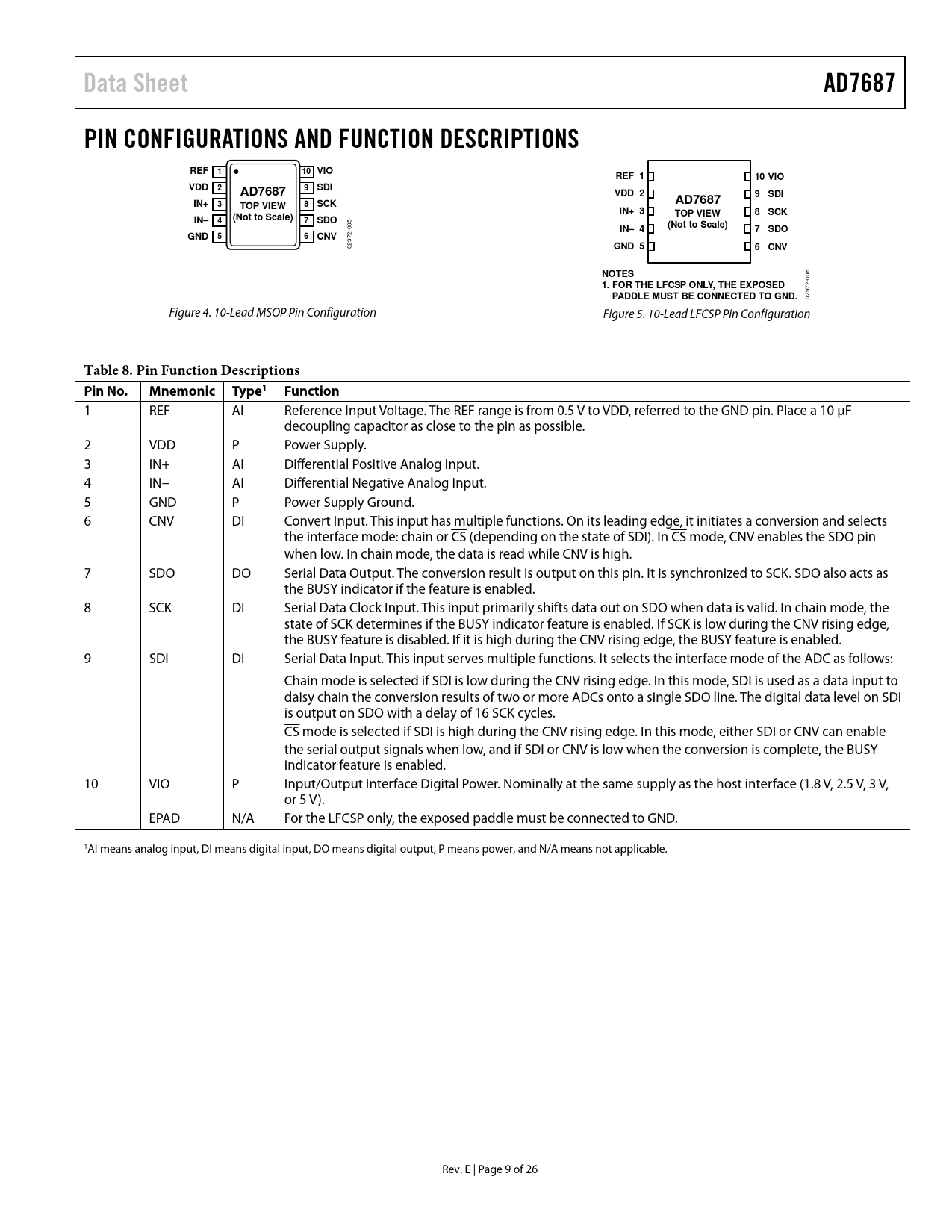 Data SheetAD7687PIN CONFIGURATIONS AND FUNCTION DESCRIPTIONSREF110 VIOREF 110 VIOVDD29SDIAD7687VDD 29 SDIIN+AD768738SCKTOP VIEWIN+ 3TOP VIEW8 SCKIN–4(Not to Scale)7SDO(Not to Scale)IN– 47 SDOGND56CNV 02972-005 GND 56 CNV 6 NOTES 00 2- 1. FOR THE LFCSP ONLY, THE EXPOSED 97 PADDLE MUST BE CONNECTED TO GND. 02 Figure 4. 10-Lead MSOP Pin Configuration Figure 5. 10-Lead LFCSP Pin Configuration Table 8. Pin Function Descriptions Pin No.MnemonicType1 Function 1 REF AI Reference Input Voltage. The REF range is from 0.5 V to VDD, referred to the GND pin. Place a 10 μF decoupling capacitor as close to the pin as possible. 2 VDD P Power Supply. 3 IN+ AI Differential Positive Analog Input. 4 IN− AI Differential Negative Analog Input. 5 GND P Power Supply Ground. 6 CNV DI Convert Input. This input has multiple functions. On its leading edge, it initiates a conversion and selects the interface mode: chain or CS (depending on the state of SDI). In CS mode, CNV enables the SDO pin when low. In chain mode, the data is read while CNV is high. 7 SDO DO Serial Data Output. The conversion result is output on this pin. It is synchronized to SCK. SDO also acts as the BUSY indicator if the feature is enabled. 8 SCK DI Serial Data Clock Input. This input primarily shifts data out on SDO when data is valid. In chain mode, the state of SCK determines if the BUSY indicator feature is enabled. If SCK is low during the CNV rising edge, the BUSY feature is disabled. If it is high during the CNV rising edge, the BUSY feature is enabled. 9 SDI DI Serial Data Input. This input serves multiple functions. It selects the interface mode of the ADC as follows: Chain mode is selected if SDI is low during the CNV rising edge. In this mode, SDI is used as a data input to daisy chain the conversion results of two or more ADCs onto a single SDO line. The digital data level on SDI is output on SDO with a delay of 16 SCK cycles. CS mode is selected if SDI is high during the CNV rising edge. In this mode, either SDI or CNV can enable the serial output signals when low, and if SDI or CNV is low when the conversion is complete, the BUSY indicator feature is enabled. 10 VIO P Input/Output Interface Digital Power. Nominally at the same supply as the host interface (1.8 V, 2.5 V, 3 V, or 5 V). EPAD N/A For the LFCSP only, the exposed paddle must be connected to GND. 1AI means analog input, DI means digital input, DO means digital output, P means power, and N/A means not applicable. Rev. E | Page 9 of 26 Document Outline FEATURES APPLICATIONS TYPICAL APPLICATION CIRCUIT GENERAL DESCRIPTION TABLE OF CONTENTS REVISION HISTORY SPECIFICATIONS TIMING SPECIFICATIONS Timing Diagrams ABSOLUTE MAXIMUM RATINGS THERMAL RESISTANCE ESD CAUTION PIN CONFIGURATIONS AND FUNCTION DESCRIPTIONS TERMINOLOGY TYPICAL PERFORMANCE CHARACTERISTICS THEORY OF OPERATION CIRCUIT INFORMATION CONVERTER OPERATION Transfer Functions TYPICAL CONNECTION DIAGRAM ANALOG INPUT DRIVER AMPLIFIER CHOICE SINGLE-TO-DIFFERENTIAL DRIVER VOLTAGE REFERENCE INPUT POWER SUPPLY SUPPLYING THE ADC FROM THE REFERENCE DIGITAL INTERFACE CS\ MODE, 3-WIRE WITHOUT BUSY INDICATOR CS\ MODE, 3-WIRE WITH BUSY INDICATOR CS\ MODE, 4-WIRE WITHOUT BUSY INDICATOR CS\ MODE, 4-WIRE WITH BUSY INDICATOR CHAIN MODE WITHOUT BUSY INDICATOR CHAIN MODE WITH BUSY INDICATOR APPLICATIONS INFORMATION LAYOUT EVALUATING THE PERFORMANCE OF THE AD7687 OUTLINE DIMENSIONS ORDERING GUIDE