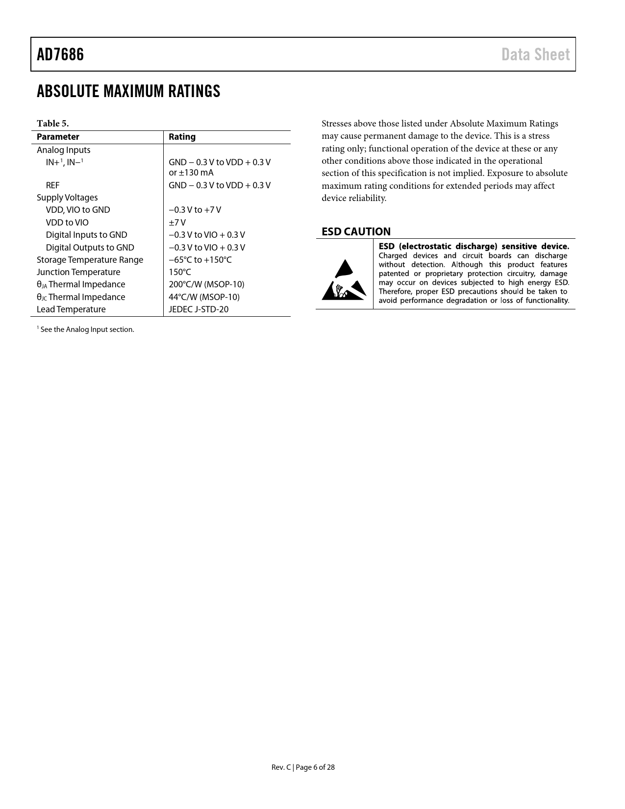 AD7686. Data Sheet. ABSOLUTE MAXIMUM RATINGS. Table 5. Parameter. Rating. ESD CAUTION