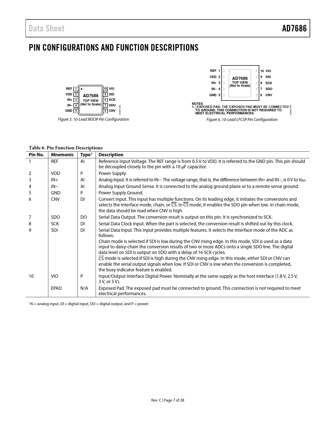 Data Sheet AD7686 PIN CONFIGURATIONS AND FUNCTION DESCRIPTIONS REF 1 10 VIO VDD 2 SDI IN+ 3 TOP VIEW SCK (Not to Scale) REF IN– 4