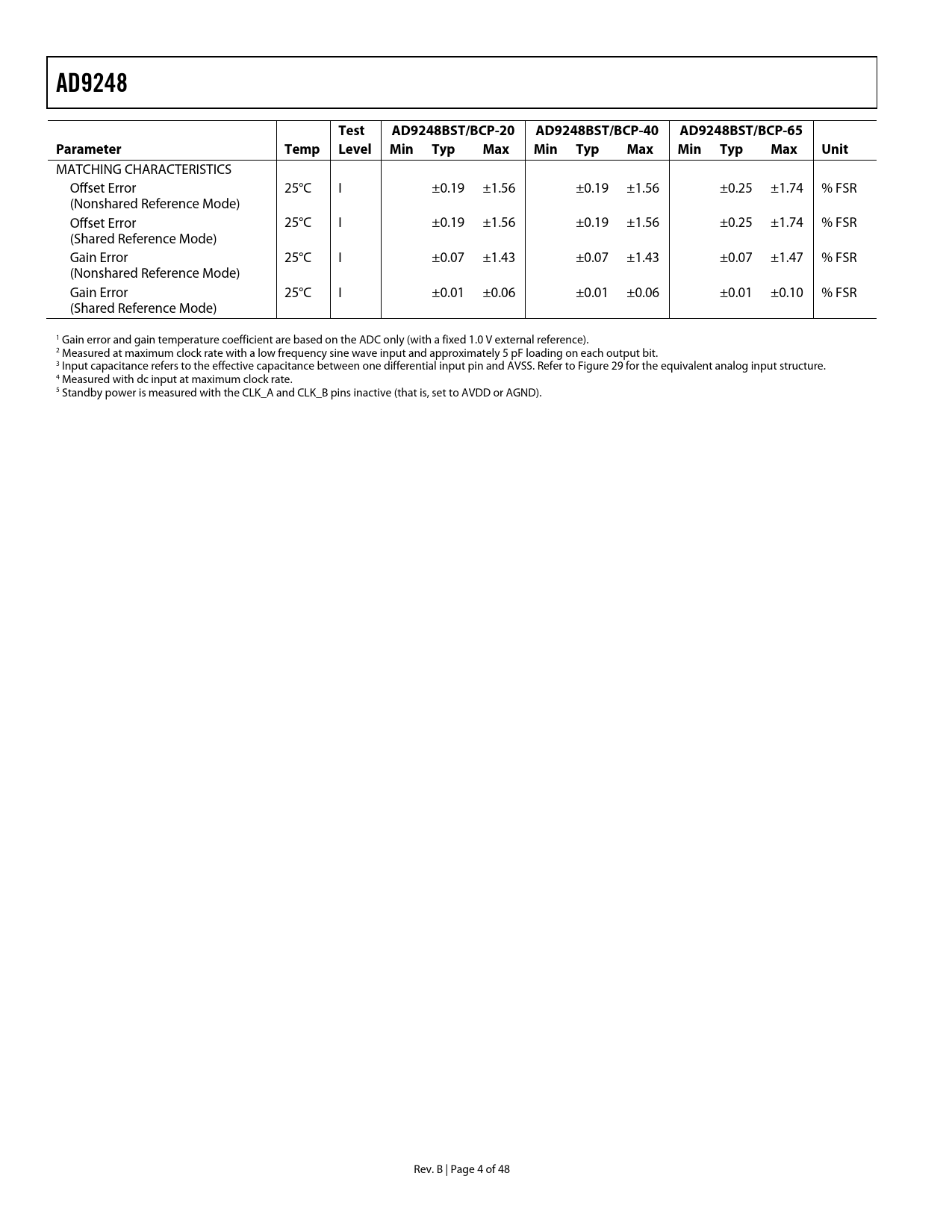 link to page 17 AD9248TestAD9248BST/BCP-20AD9248BST/BCP-40AD9248BST/BCP-65ParameterTempLevelMinTypMaxMinTypMaxMinTypMaxUnit MATCHING CHARACTERISTICS Offset Error 25°C I ±0.19 ±1.56 ±0.19 ±1.56 ±0.25 ±1.74 % FSR (Nonshared Reference Mode) Offset Error 25°C I ±0.19 ±1.56 ±0.19 ±1.56 ±0.25 ±1.74 % FSR (Shared Reference Mode) Gain Error 25°C I ±0.07 ±1.43 ±0.07 ±1.43 ±0.07 ±1.47 % FSR (Nonshared Reference Mode) Gain Error 25°C I ±0.01 ±0.06 ±0.01 ±0.06 ±0.01 ±0.10 % FSR (Shared Reference Mode) 1 Gain error and gain temperature coefficient are based on the ADC only (with a fixed 1.0 V external reference). 2 Measured at maximum clock rate with a low frequency sine wave input and approximately 5 pF loading on each output bit. 3 Input capacitance refers to the effective capacitance between one differential input pin and AVSS. Refer to Figure 2 f 9 or the equivalent analog input structure. 4 Measured with dc input at maximum clock rate. 5 Standby power is measured with the CLK_A and CLK_B pins inactive (that is, set to AVDD or AGND). Rev. B | Page 4 of 48 Document Outline FEATURES APPLICATIONS GENERAL DESCRIPTION FUNCTIONAL BLOCK DIAGRAM PRODUCT HIGHLIGHTS TABLE OF CONTENTS REVISION HISTORY SPECIFICATIONS DC SPECIFICATIONS AC SPECIFICATIONS DIGITAL SPECIFICATIONS SWITCHING SPECIFICATIONS ABSOLUTE MAXIMUM RATINGS EXPLANATION OF TEST LEVELS ESD CAUTION PIN CONFIGURATIONS AND FUNCTION DESCRIPTIONS TERMINOLOGY TYPICAL PERFORMANCE CHARACTERISTICS EQUIVALENT CIRCUITS THEORY OF OPERATION ANALOG INPUT Differential Input Configurations Single-Ended Input Configuration CLOCK INPUT AND CONSIDERATIONS POWER DISSIPATION AND STANDBY MODE DIGITAL OUTPUTS TIMING DATA FORMAT VOLTAGE REFERENCE Internal Reference Connection External Reference Operation AD9248 LQFP EVALUATION BOARD CLOCK CIRCUITRY ANALOG INPUTS REFERENCE CIRCUITRY DIGITAL CONTROL LOGIC OUTPUTS LQFP EVALUATION BOARD BILL OF MATERIALS (BOM) LQFP EVALUATION BOARD SCHEMATICS LQFP PCB LAYERS DUAL ADC LFCSP PCB POWER CONNECTOR ANALOG INPUTS OPTIONAL OPERATIONAL AMPLIFIER CLOCK VOLTAGE REFERENCE DATA OUTPUTS LFCSP EVALUATION BOARD BILL OF MATERIALS (BOM) LFCSP PCB SCHEMATICS LFCSP PCB LAYERS THERMAL CONSIDERATIONS OUTLINE DIMENSIONS ORDERING GUIDE