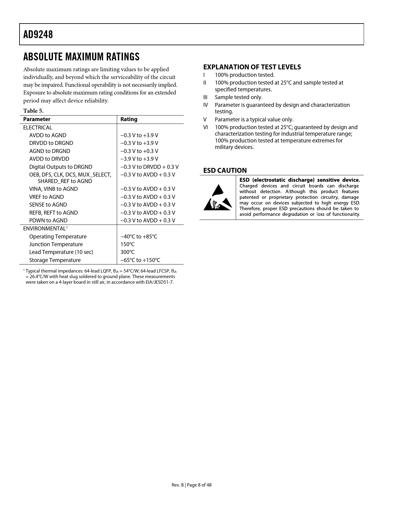 link to page 9 AD9248ABSOLUTE MAXIMUM RATINGS Absolute maximum ratings are limiting values to be applied EXPLANATION OF TEST LEVELS individually, and beyond which the serviceability of the circuit I 100% production tested. may be impaired. Functional operability is not necessarily implied. II 100% production tested at 25°C and sample tested at specified temperatures. Exposure to absolute maximum rating conditions for an extended III Sample tested only. period may affect device reliability. IV Parameter is guaranteed by design and characterization Table 5. testing. Parameter Rating V Parameter is a typical value only. ELECTRICAL VI 100% production tested at 25°C; guaranteed by design and AVDD to AGND −0.3 V to +3.9 V characterization testing for industrial temperature range; 100% production tested at temperature extremes for DRVDD to DRGND −0.3 V to +3.9 V military devices. AGND to DRGND −0.3 V to +0.3 V AVDD to DRVDD −3.9 V to +3.9 V Digital Outputs to DRGND −0.3 V to DRVDD + 0.3 V ESD CAUTION OEB, DFS, CLK, DCS, MUX_SELECT, −0.3 V to AVDD + 0.3 V SHARED_REF to AGND VINA, VINB to AGND −0.3 V to AVDD + 0.3 V VREF to AGND −0.3 V to AVDD + 0.3 V SENSE to AGND −0.3 V to AVDD + 0.3 V REFB, REFT to AGND −0.3 V to AVDD + 0.3 V PDWN to AGND −0.3 V to AVDD + 0.3 V ENVIRONMENTAL1 Operating Temperature −40°C to +85°C Junction Temperature 150°C Lead Temperature (10 sec) 300°C Storage Temperature −65°C to +150°C 1 Typical thermal impedances: 64-lead LQFP, θJA = 54°C/W; 64-lead LFCSP, θJA = 26.4°C/W with heat slug soldered to ground plane. These measurements were taken on a 4-layer board in still air, in accordance with EIA/JESD51-7. Rev. B | Page 8 of 48 Document Outline FEATURES APPLICATIONS GENERAL DESCRIPTION FUNCTIONAL BLOCK DIAGRAM PRODUCT HIGHLIGHTS TABLE OF CONTENTS REVISION HISTORY SPECIFICATIONS DC SPECIFICATIONS AC SPECIFICATIONS DIGITAL SPECIFICATIONS SWITCHING SPECIFICATIONS ABSOLUTE MAXIMUM RATINGS EXPLANATION OF TEST LEVELS ESD CAUTION PIN CONFIGURATIONS AND FUNCTION DESCRIPTIONS TERMINOLOGY TYPICAL PERFORMANCE CHARACTERISTICS EQUIVALENT CIRCUITS THEORY OF OPERATION ANALOG INPUT Differential Input Configurations Single-Ended Input Configuration CLOCK INPUT AND CONSIDERATIONS POWER DISSIPATION AND STANDBY MODE DIGITAL OUTPUTS TIMING DATA FORMAT VOLTAGE REFERENCE Internal Reference Connection External Reference Operation AD9248 LQFP EVALUATION BOARD CLOCK CIRCUITRY ANALOG INPUTS REFERENCE CIRCUITRY DIGITAL CONTROL LOGIC OUTPUTS LQFP EVALUATION BOARD BILL OF MATERIALS (BOM) LQFP EVALUATION BOARD SCHEMATICS LQFP PCB LAYERS DUAL ADC LFCSP PCB POWER CONNECTOR ANALOG INPUTS OPTIONAL OPERATIONAL AMPLIFIER CLOCK VOLTAGE REFERENCE DATA OUTPUTS LFCSP EVALUATION BOARD BILL OF MATERIALS (BOM) LFCSP PCB SCHEMATICS LFCSP PCB LAYERS THERMAL CONSIDERATIONS OUTLINE DIMENSIONS ORDERING GUIDE