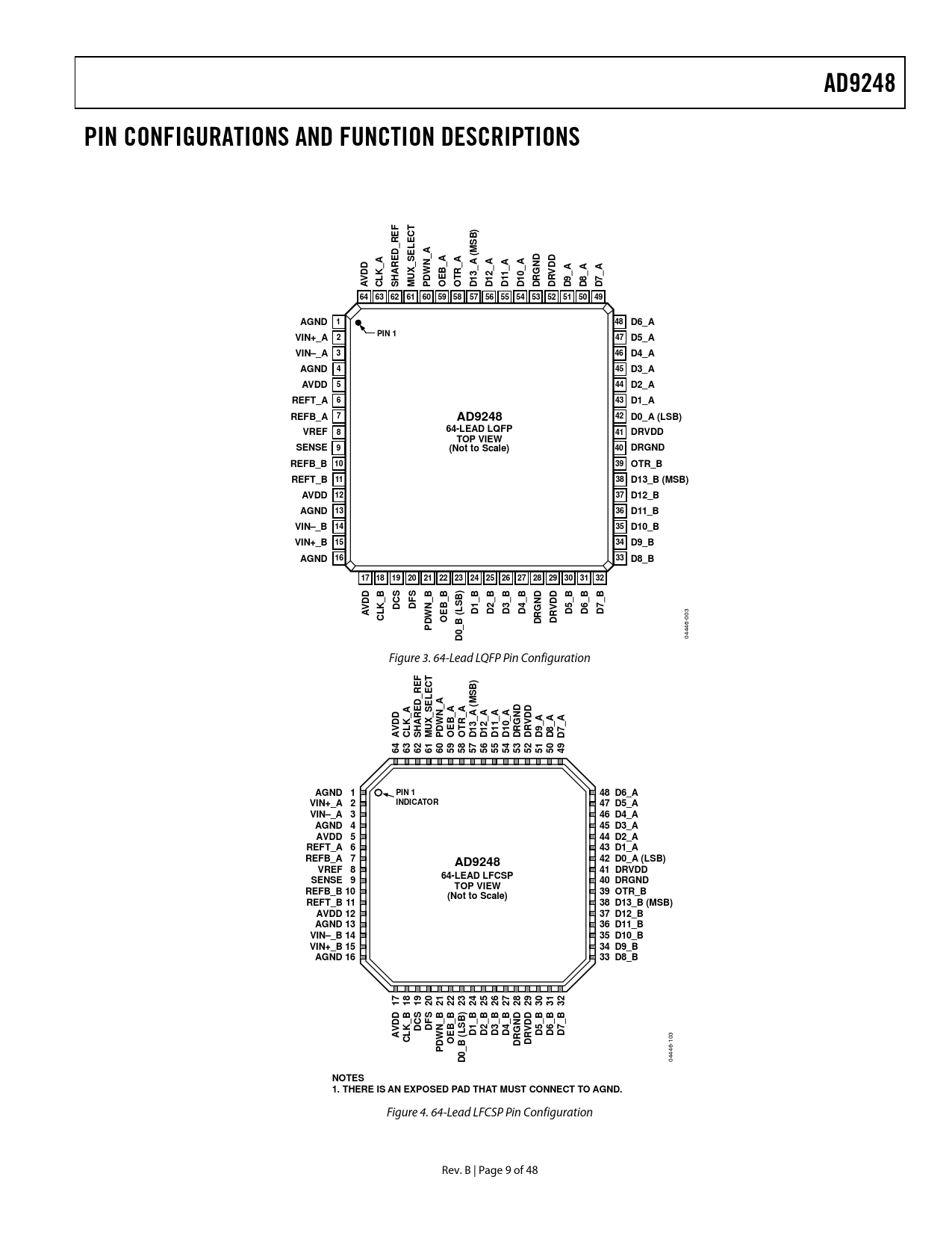 F T ) C E B L S D_RE A M _ A N A _ _ A ( A A A ND DD DD K_A X_SE W B _ _ A R HARE AV CL S MU PD OE OT D13 D12 D11_ D10_ DRG DRV D9_A D8_ D7_A 64 63 62 61 60 59 58 57 56 55 54 53 52 51 50 49 AGND 1 PIN 1 48 D6_A VIN+_A INDICATOR 2 47 D5_A VIN–_A 3 46 D4_A AGND 4 45 D3_A AVDD 5 44 D2_A REFT_A 6 43 D1_A REFB_A 7 42 D0_A (LSB) AD9248 VREF 8 41 DRVDD 64-LEAD LFCSP SENSE 9 40 DRGND TOP VIEW REFB_B 10 39 OTR_B (Not to Scale) REFT_B 11 38 D13_B (MSB) AVDD 12 37 D12_B AGND 13 36 D11_B VIN–_B 14 35 D10_B VIN+_B 15 34 D9_B AGND 16 33 D8_B 17 18 19 20 21 22 23 24 25 26 27 28 29 30 31 32 B S B B ) DD _ _ _ B ND DD K DCS DF N B S L D1_B D2_B D3_B D4_B D5_B D6_B D7_B AV