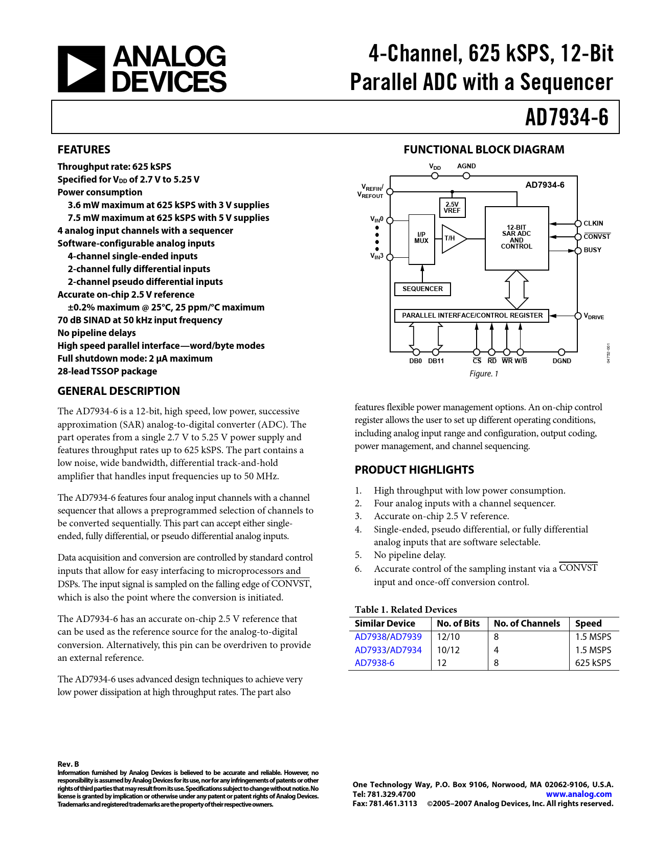 4-Channel, 625 kSPS, 12-Bit. Parallel ADC with a Sequencer. AD7934-6. FEATURES. FUNCTIONAL BLOCK DIAGRAM